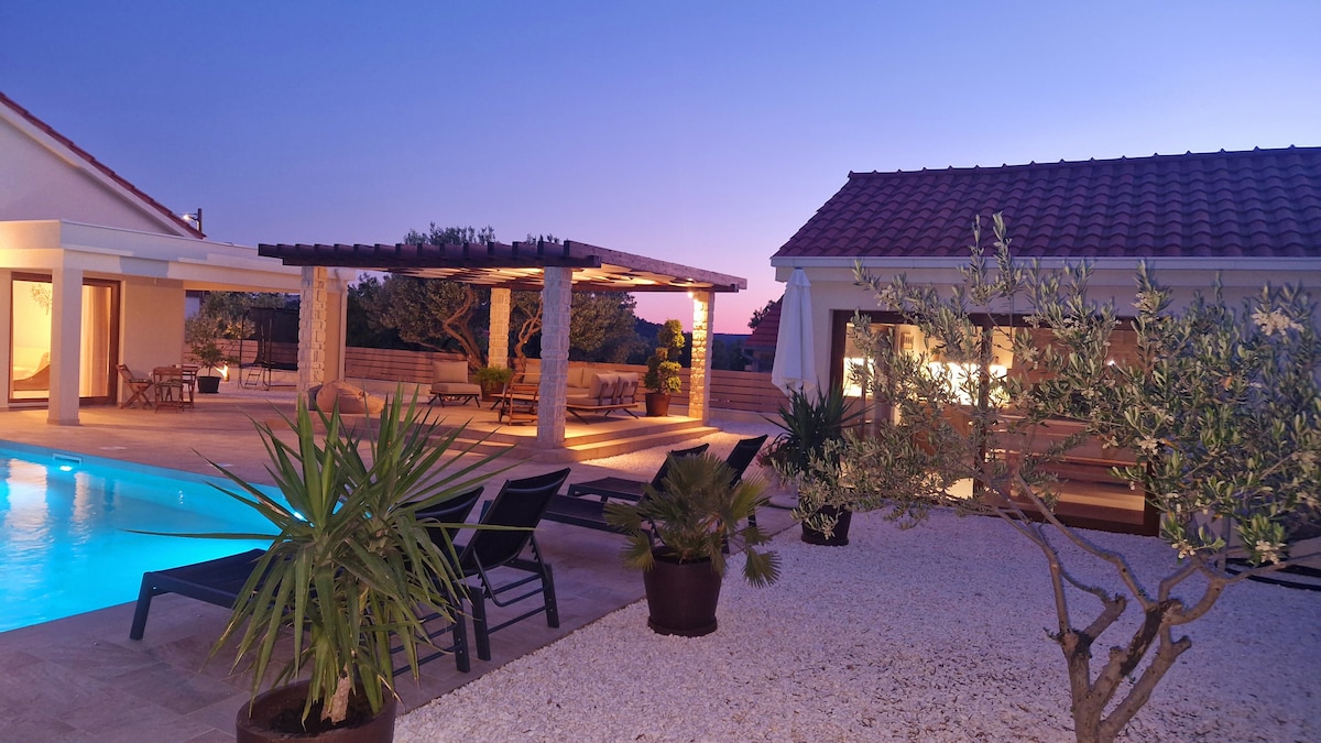 This beautiful villa with heated pool, hot tub and sauna is set on a remote and secluded landscape with a breath-taking view over the valley Heated pool from April to November Great place for relaxing and a starting point for exploring the region and Croatia! City distance Zadar is 28 km (airport 20 km) away Šibenik is 50 km away Split is 125 km (airport 99 km) away Attraction distance Plitvice lakes 125 km away Krka 45 km away Kornati 30 km away