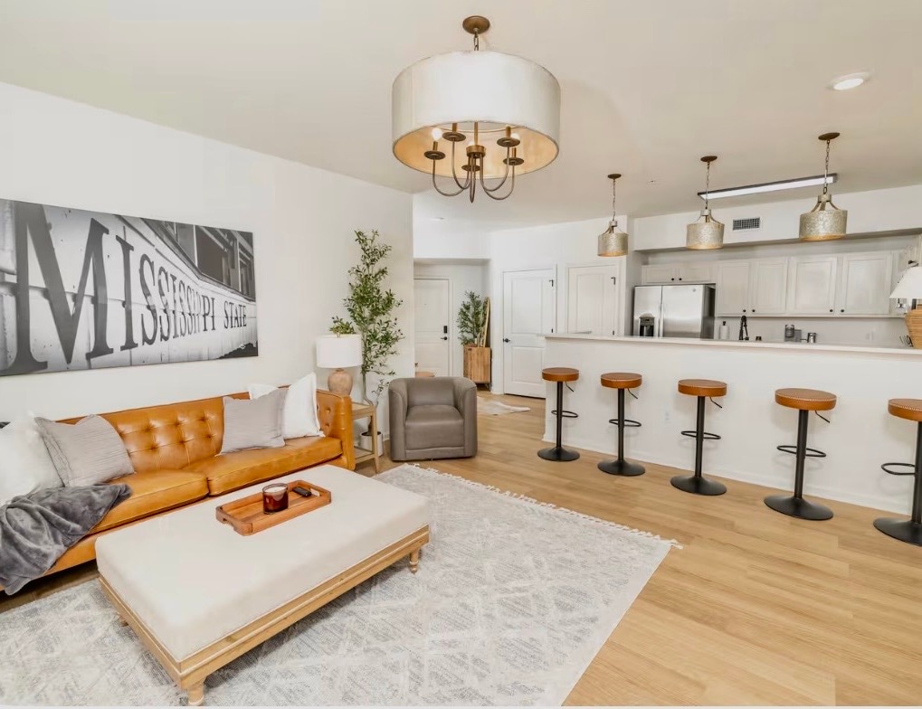 This newly renovated Condo is located on the border of the MSU campus! Sleeps 6! Only .7 tenths of a mile from DAVIS WADE stadium, The HUMP and DUDY NOBILE field! LOCATION IS AWESOME within a 15-minute walk! Shuttle service is available with stops at the complex entrance to campus events. The space includes 2 bedroom and 2 1/2 baths. One bedroom with a Queen bed and the second bedroom with 2 twin beds. The comfy couch in den area. Washer and Dryer on site. Note: UPSTAIRS UNIT.