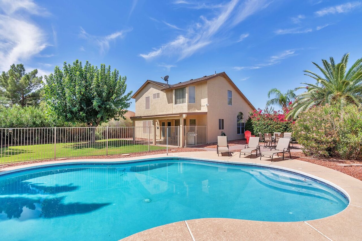 Family friendly Entertaining Home; Large covered patio with plenty of seating, fire table, Treager grill, Overlooking 10ft private heated pool Oct-May (included). Fully stocked chefs kitchen- double ovens, gas cooktop. Comfy beds, smart TVs in all bedrooms. Baby/kid friendly items. A perfect location for your Arizona getaway. Only 0.8 miles from the State Farm Stadium, Desert Diamond, Westgate with tons of local restaurants and adventures avoid traffic and walk to your event! Weekly discounts.