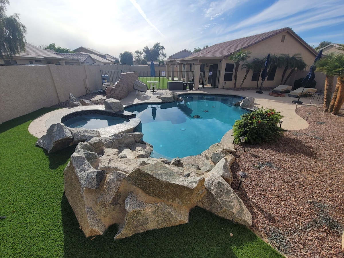 Easy walk to Statefarm and Desert Diamond Arena. Closest house to stadiums. Also located near Westgate Entertaiment District, Free Heated Pool, Hot Tub, Outdoor Kitchen Short walk to Statefarm Stadium, Desert Diamond Arena, Less than 5 minute drive to Top Golf, PopStroke, Andrettti Racing Karts, Chicken and Pickle. Less than 20 minute drive to several SpringTraining Facilities. 5 Full service Golf Courses within 15 minutes Heated Pool (please ask about heat prior to check in), covered patio a