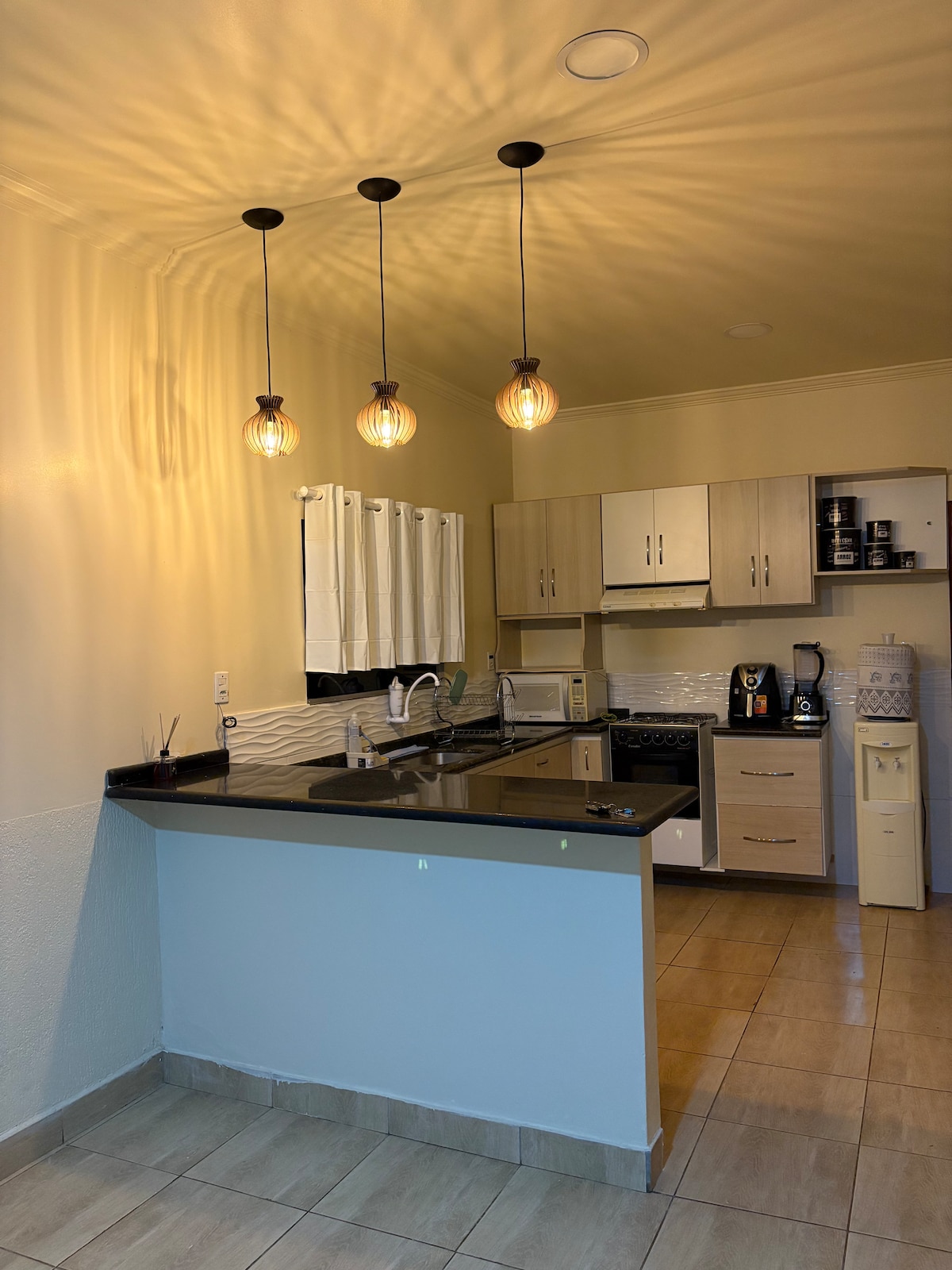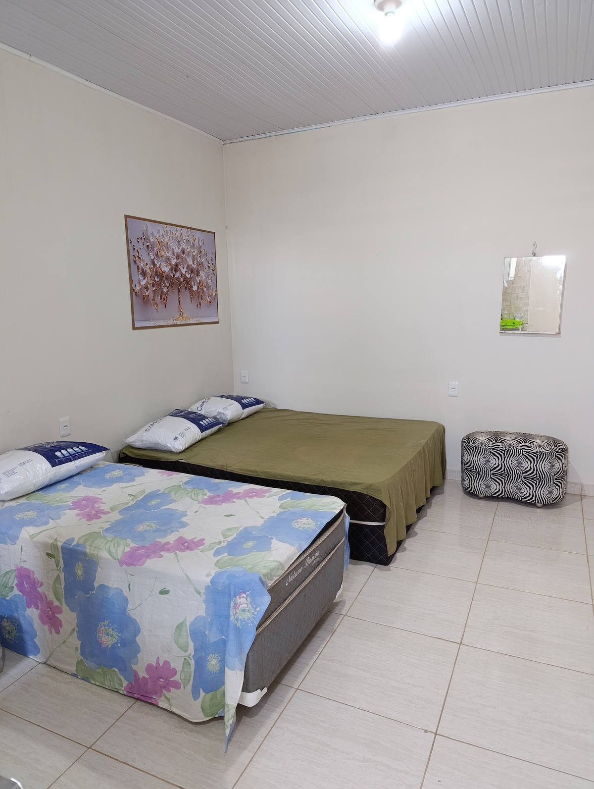 Casa completa com muito espaço, área de lazer, área de serviço com maquina de lavar, duas suítes, sala de estar/jantar, cozinha espaçosa com fogão e geladeira, tv, sofá, camas king size confortáveis em uma casa bem cuidada.