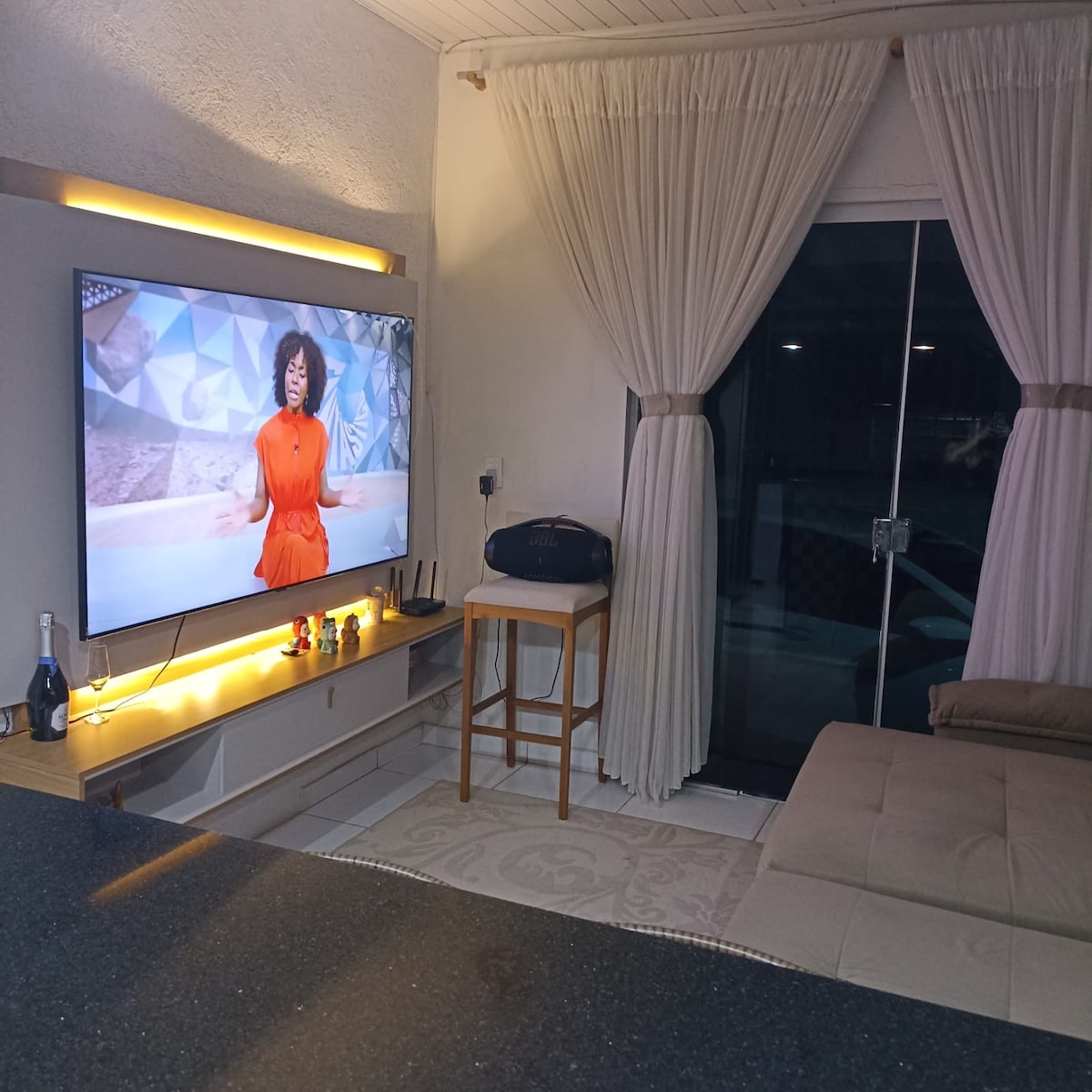 Aqui, cada detalhe foi pensado para que você se sinta em casa. Espaço ideal para famílias e viagens a trabalho. O espaço: 3 quartos, sendo 1 suíte. Sala com TV Smart 50” e streamings inclusos HBO Max e Prime. Cozinha completa para preparar suas refeições. Área com churrasqueira. Redes para relaxar. Internet rápida (600MB) O que mais você vai gostar: ✔️ Ar-condicionado em 2 quartos; ✔️ Chuveiros com água quente; ✔️ Kit boas-vindas com café, chá e biscoitos.