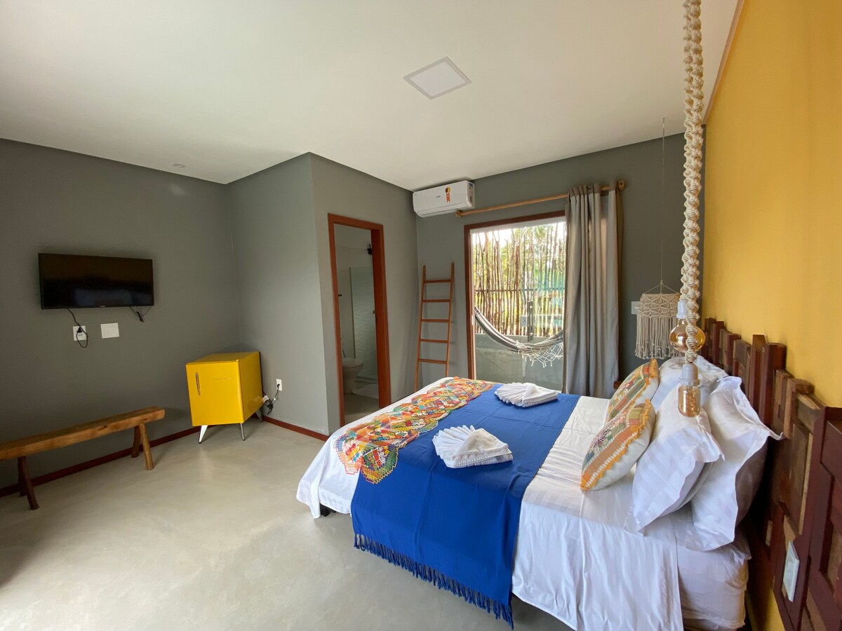 O quarto possui uma cama queen, frigobar e ar-condicionado split, oferecendo privacidade e máximo conforto para duas pessoas.