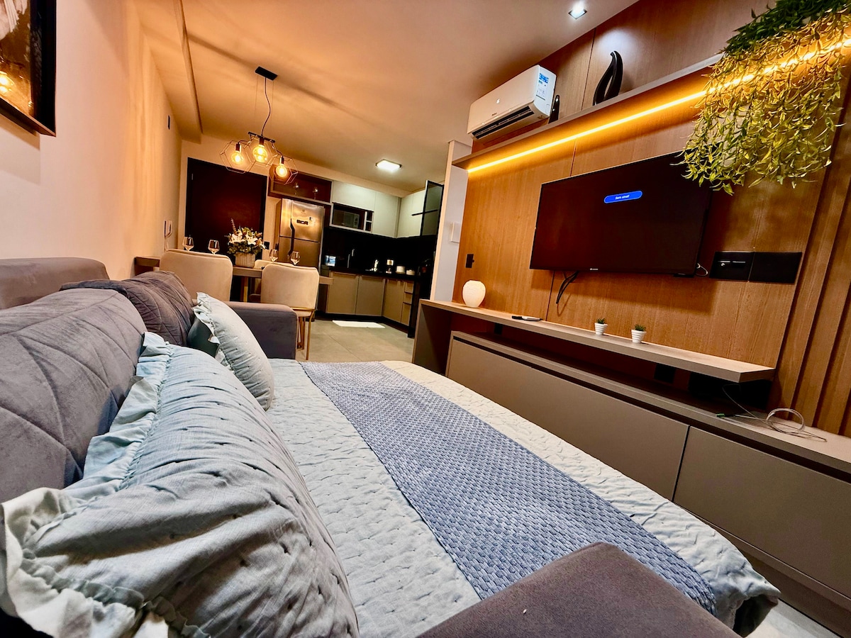 Prédio de frente pra a praia Jatiuca Apartamento aconchegante com móveis novos, ambiente Clean com ar condicionado no quarto casal, cozinha americana completa, sala com TV e internet fibra optica dedicada, máquina de lavar e secar, totalmente decorado.