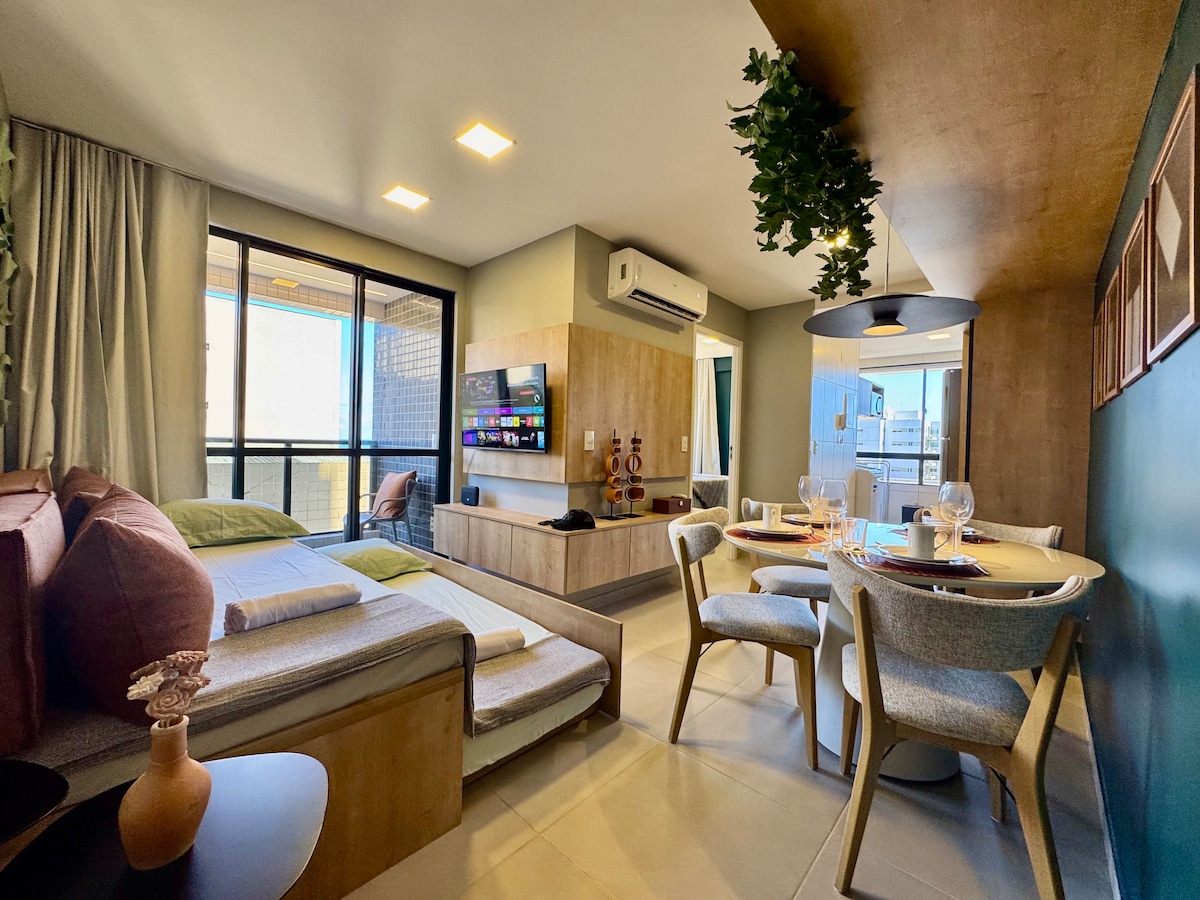 Prédio de frente pra a praia Jatiuca Apartamento aconchegante com móveis novos, ambiente Clean com ar condicionado no quarto casal, cozinha americana completa, sala com TV e internet fibra optica dedicada, máquina de lavar e secar, totalmente decorado.