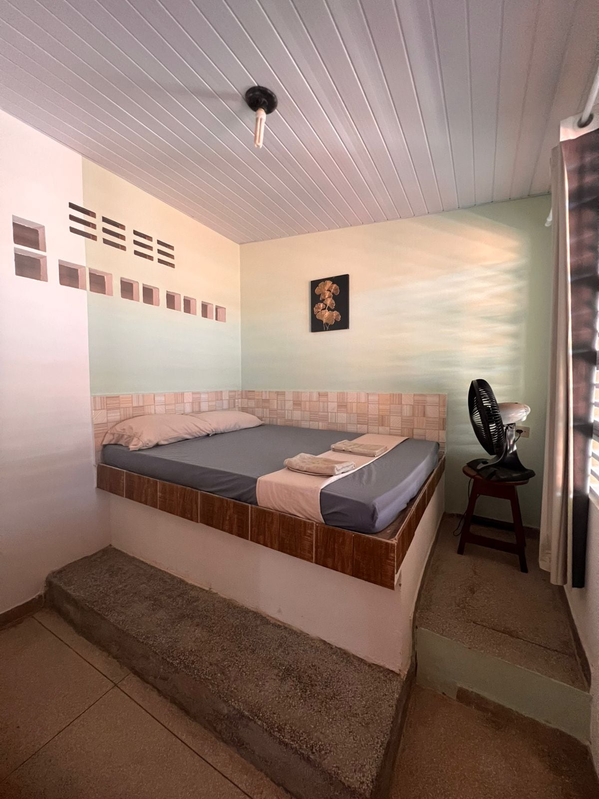 Nosso quarto duplo menor é um refúgio acolhedor para casais. Inclui cama confortável, ventilador, cabideiro e prateleiras. Sua característica única: pequenas aberturas na parede que criam luz natural e ventilação constante, garantindo uma atmosfera especial e fresca para seu descanso em Barra Grande. Viva a Experiência Completa: Banheiro compartilhado (sempre impecável) Cozinha totalmente equipada Áreas comuns que convidam a novas amizades Café da manhã caseiro do Abel incluído