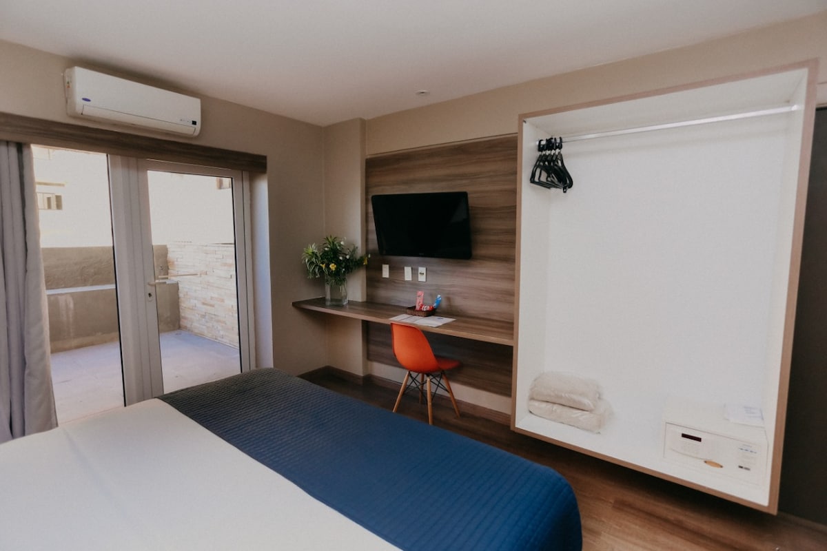 Apartamentos amplos com 30m² e confortáveis, com decoração moderna e equipados com: - 01 Cama box super King Size; - TV LED 32” com canais a cabo; - Internet WiFi (gratuito); - Banheiro equipado com secador de cabelo; - Ferro e tábua para passar roupas; - Mesa e cadeira de trabalho; - Linha telefônica com discagem direta; - Cofre com fechadura digital; - Rádio relógio; - Frigobar; - Ar-condicionado central; - Chaves com sistema de cartão eletrônico.