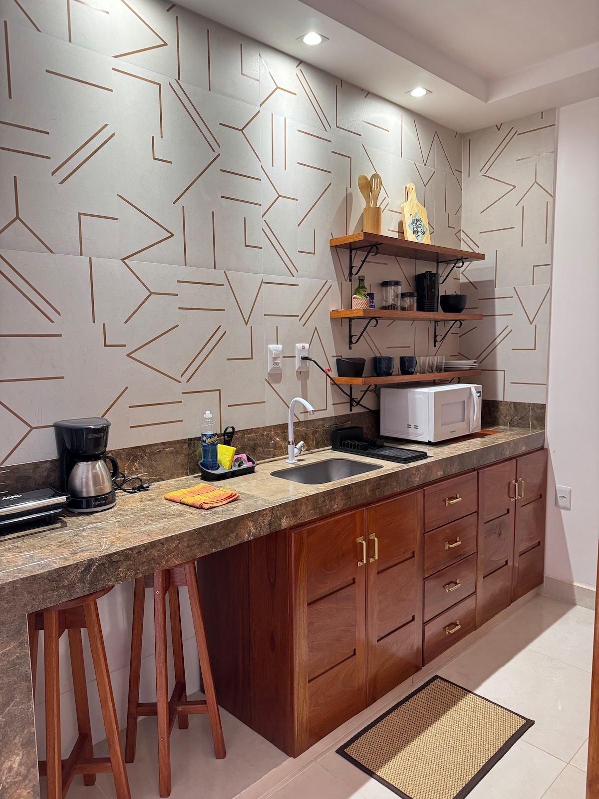 Modern and cozy studio designed for your comfort and convenience. Located on the first floor, featuring thermoacoustic panels that give the space a unique personality. It offers 17m² of indoor space + 5m² of balcony with a shared laundry area. Tempered glass doors with reflective film (90% coverage), with curtains recommended at night for better privacy. Independent entrance, attached to the host’s house. Parking available upon request for an additional fee.