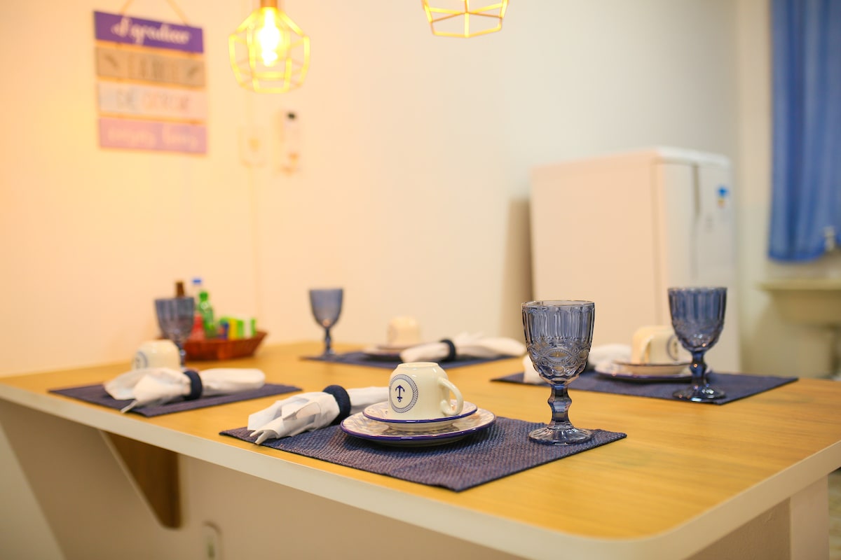 Apartamento sofisticado e requintado para hóspedes que buscam conforto e tranquilidade. Piscina Privativa. Estilo studio, amplo espaço com uma mesa de jantar para 8 pessoas no seu interior. O espaço possui TV, WiFi, central de ar, uma cama Queen e banheiro. O diferencial está na sua área externa, onde há um espaço gourmet com piscina, micro-ondas, fogão e louças. Ótimo lugar para bate-papo. Apartamento no andar térreo (Sem garagem).