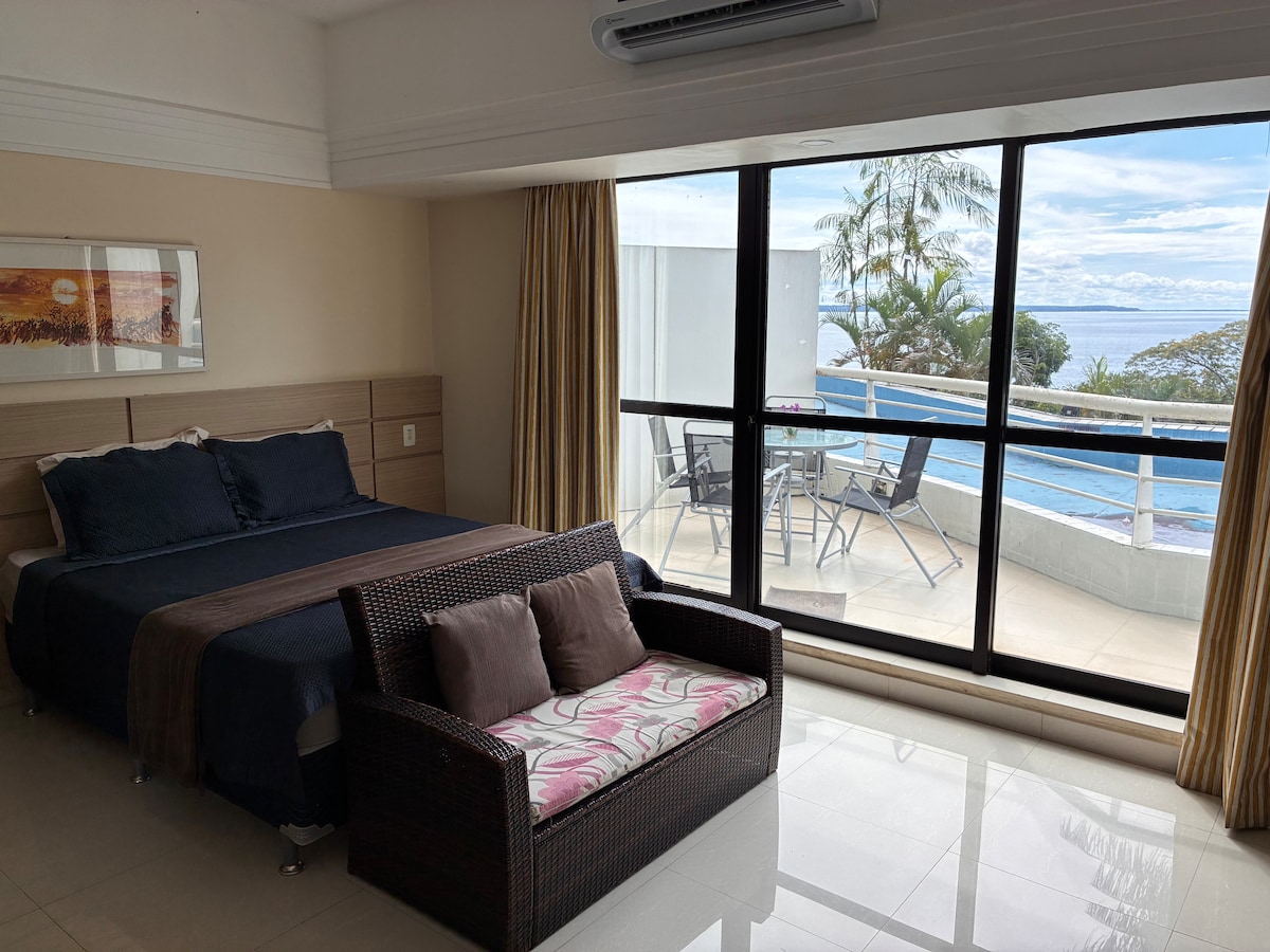 Flat no Tropical Executive Hotel bem projetado com linda vista para o rio. Quarto com ar-condicionado, uma cama queen Ortobom e uma cama auxiliar, TV 55”, wi-fi, mesa de jantar 2 lugares e uma linda pintura temática para registrar sua vinda a Manaus. Às vezes é possível ver botos no rio. Temos secador de cabelo, ferro de passar a vapor, purificador de água, cafeteira Dulce Gusto + cápsulas, microondas, cooktop 2 bocas, liquidificador, panelas, talheres e utensílios próprios, geladeira e TV.