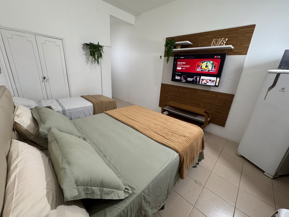 Blue, inspiring and relaxing. We invite you to enjoy this fully equipped 25m² studio, superbly located in the Eldorado neighborhood, on a quiet and safe street, close to the Arena da Amazônia, Ponta Negra, and the historical and cultural center of Manaus. A cozy and intimate space, suitable for your work, tourism, and leisure days. It offers a calm and familiar environment, perfect for your stay: - Equipped kitchen - Bathroom - Wi-Fi - Smart TV and air conditioning - Comfortable bed