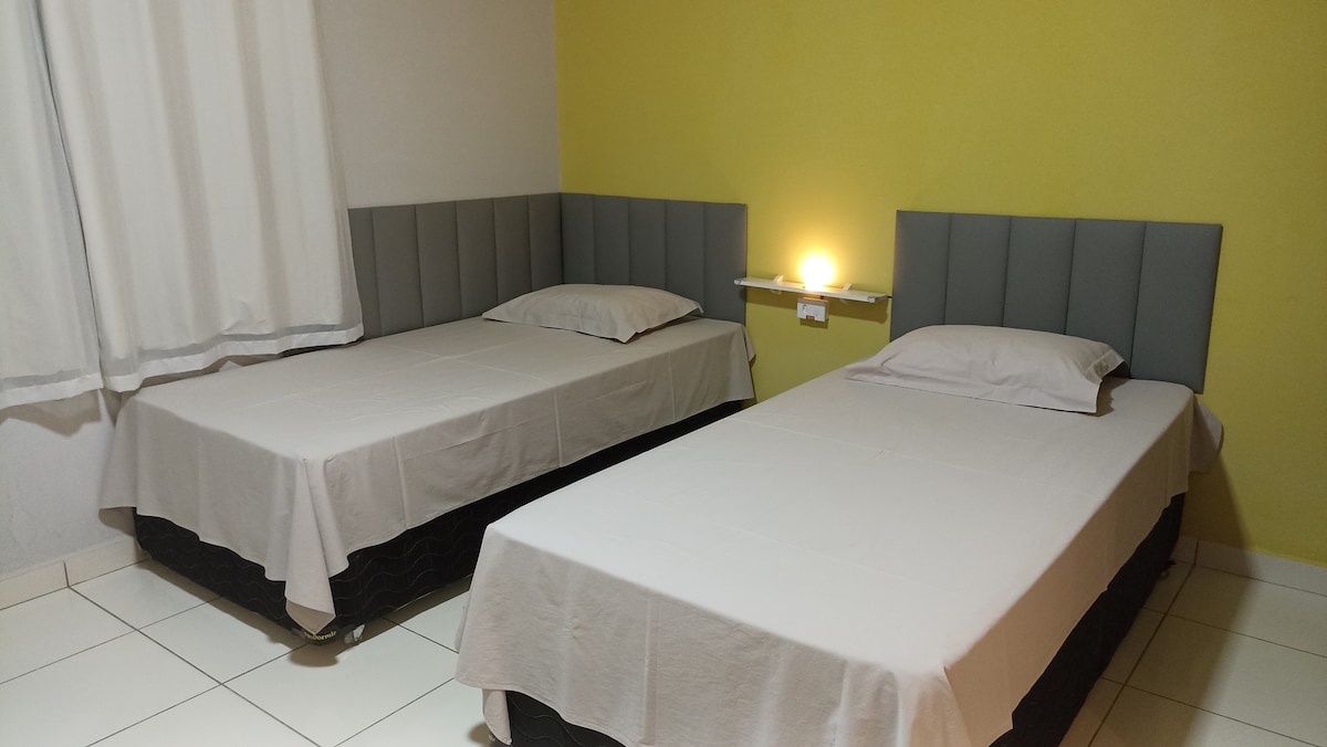 Aproveite o fácil acesso a lojas e restaurantes populares ficando neste espaço charmoso. Próximo ao Shopping, padarias, supermercados. Ambiente Familiar com Wi-Fi incluído, acesso a cozinha, lavandaria, pátio externo. Você pode optar por 1 cama de casal ou duas de solteiro.
