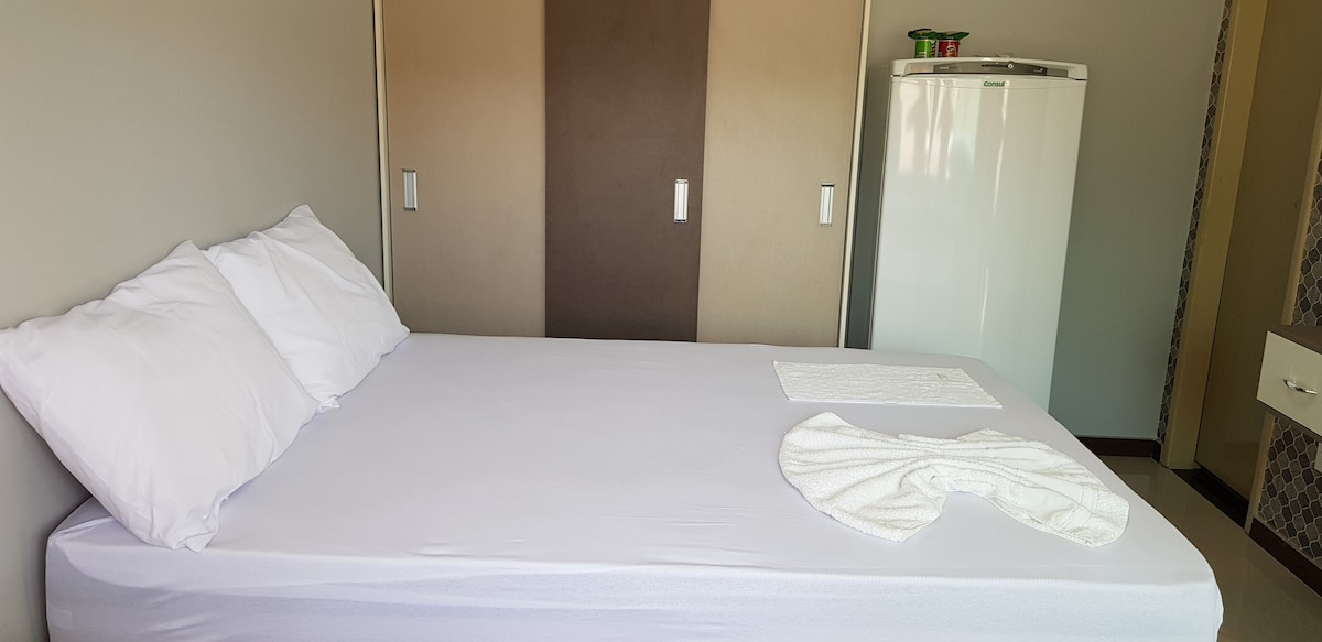 Kitnet confortável e reservada. Fica separada da casa principal, possibilitando a entrada e saída a vontade. Possui um quarto com cama de casal, um banheiro e uma cozinha/sala. Microondas, fogão sem forno, frigobar e cafeteira. Disponibilizamos lençol, travesseiros, toalhas e papel higiênico. Sem chuveiro elétrico no momento e não é permitido cães ou gatos