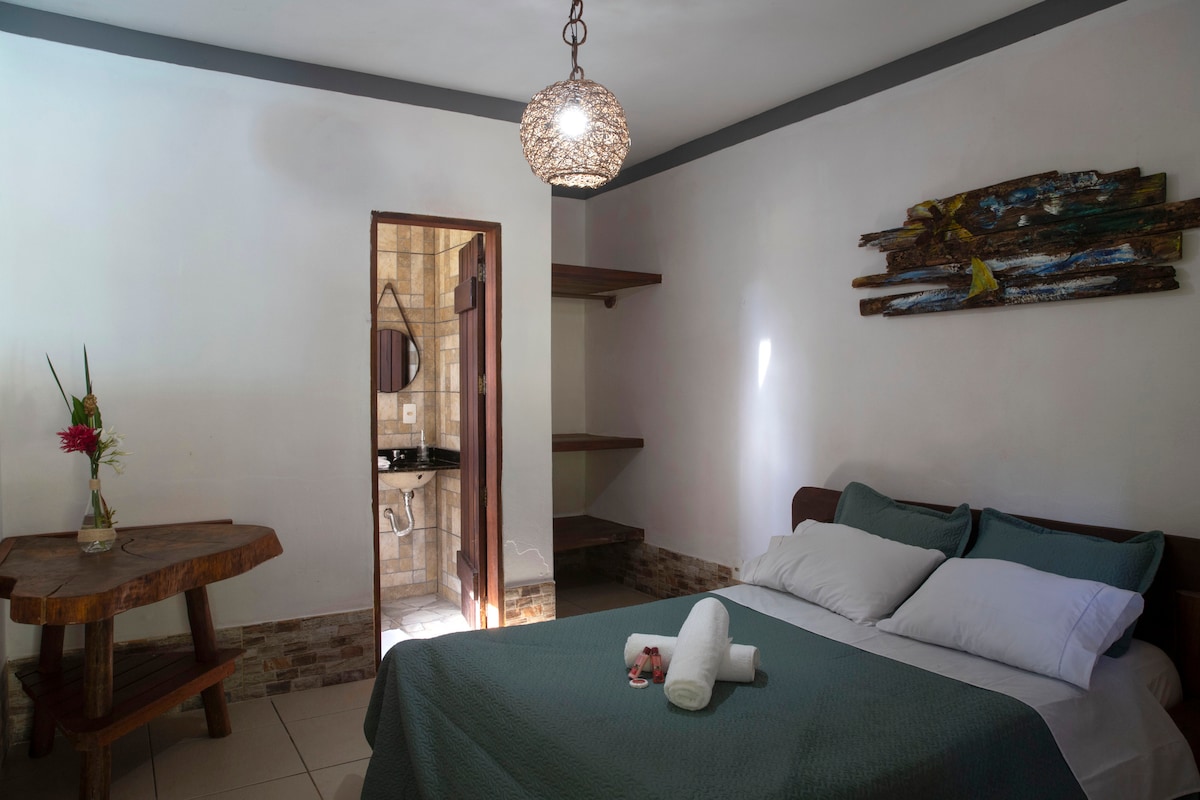 Chalé Cajá da Pousada Colmeia. Chalé com charmosa e confortável suíte, com tudo pensado para o seu conforto. Cama super king (também possível 2 de solteiro), TV Android com acesso a todos os canais e streaming, mini bar, ar condicionado, ventilador de teto, blackout. Banheiro com duas pias em estilo frances (box e vaso em compartimentos separados) e chuveiro com acesso para jardim privativo!