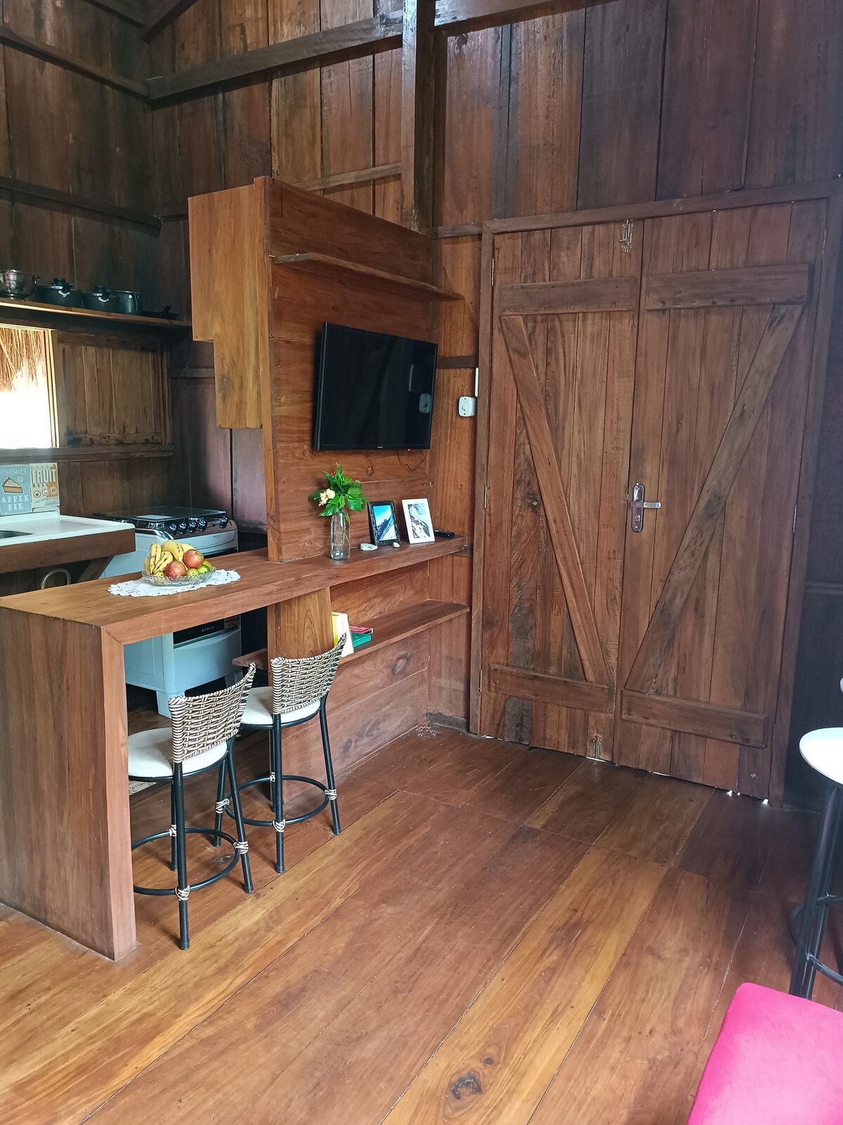 Chalé independente de 35mq, cama king size, ar condicionado, banheiro espaçoso, TV Smart, WI-FI fibra otica, cozinha ao ar livre, compartilhada entre os 2 chalés da Casa (com armários separados e utensílios de cozinha para cada chalé), totalmente equipada , varanda com rede, limpeza diária de quartos e áreas comuns. 200 MT das Praias Araçaipe e Pescadores