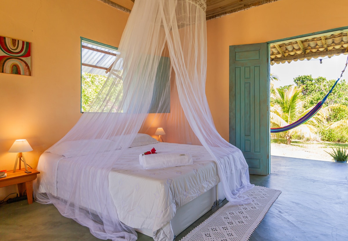 À 100 metros das mais belas e bem frequentadas praias do Arraial d'Ajuda, a do Araçaipe e do Apaga Fogo. Com acesso à praia bem em frente. Em meio a 3000m2 de área verde, localizado entre o rio e o mar, chalé aconchegante no condomínio privado, Salamandra, para quem gosta do contato com a Natureza e conforto. Privado, seguro, simples e tranquilo. Estilo rústico, decoração e iluminação agradáveis. Próximo às balsas para Porto Seguro e 3 km do centro de Arraial. Vc vai se sentir em casa!