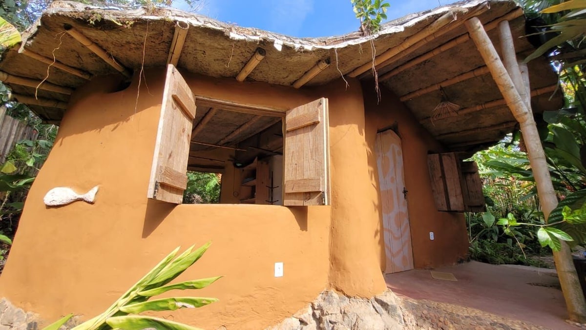 Refúgio na Floresta da ilha de Boipeba. À 800m-Piscinas Naturais do Moreré, 200m-Vila Quilombola Monte Alegre e 3km-Vila de Boipeba. Com a casa feita de barro somos parte da Natureza. O intuito aqui é ser harmônico e se misturar ao espaço. Por isso a casa foi feita com material mais sustentável: madeira, garrafas, vidros e janelas de ônibus e carro. Sanitário seco por câmara compostável, e água que nasce ali e volta pelo círculo de bananeiras. Estar ali pra mim é sentir-se um só com a mãeTerra.