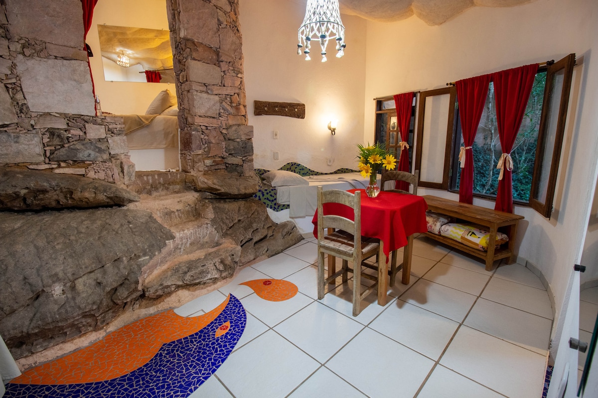 Em um espaço do nosso quintal em meio às árvores, construímos um chalé de SuperAdobe com varias mãos. O fato de ser uma construção natural faz com que ele tenha uma temperatura agradável o ano todo, além do astral super legal de dormir em um local redondo feito de barro. O chalé possui um dormitório com cama de casal, uma cama de solteiro e uma cozinha equipada com fogão, utensílios e frigobar além de um banheiro e varanda com rede.