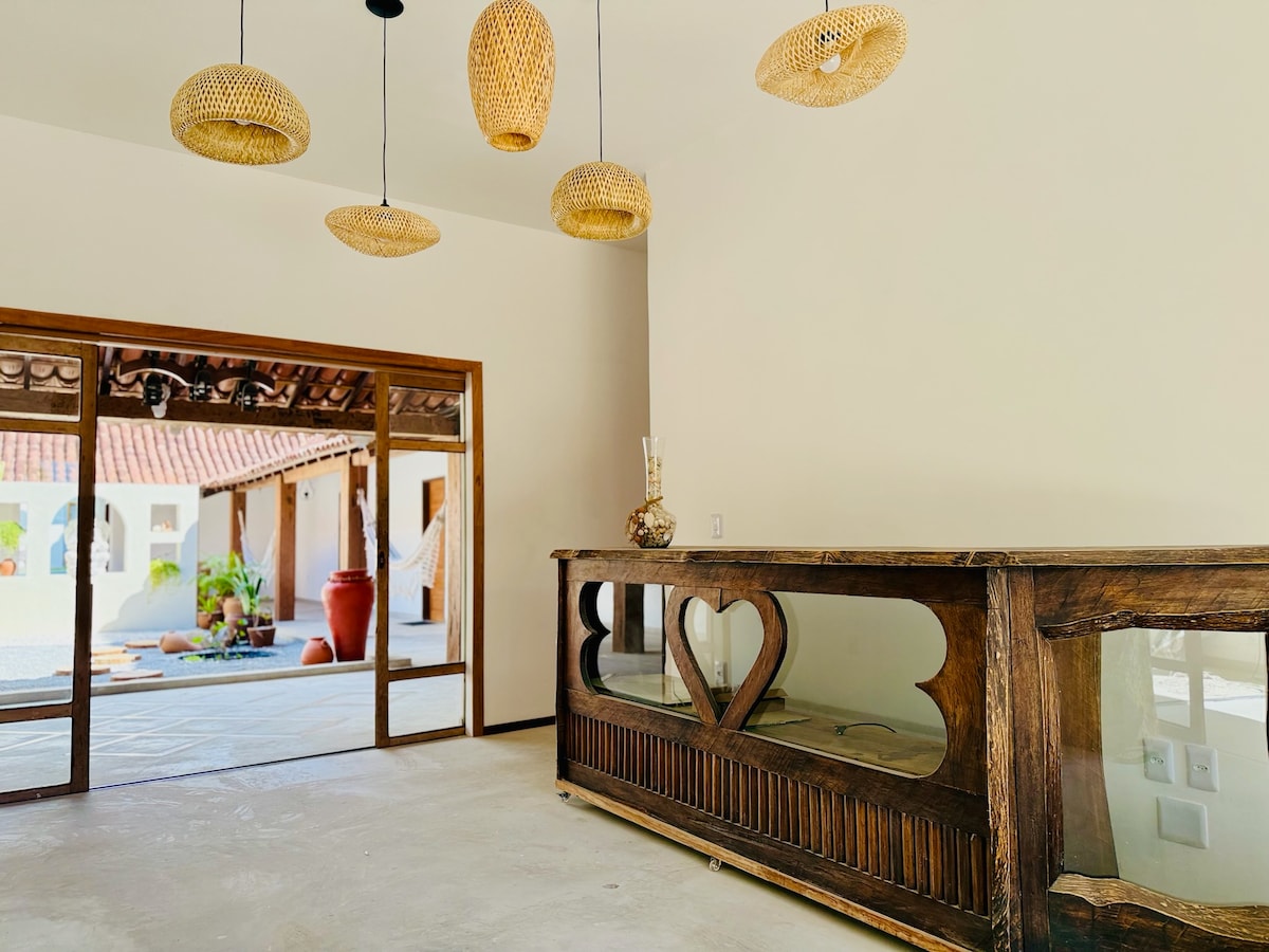 Uma casinha construída e decorada com muito carinho. Charmosa, confortável, acolhedora, pertinho da bela praia da Bombaça. Dispõe de cozinha bem equipada, redes, ar condicionado, ventilador de teto, além de área de serviço com máquina de lavar. Situada em um condomínio fechado, com lagos e muito verde, é um local de natureza exuberante, silêncio e privacidade. Aqui você acorda com o canto dos pássaros, e escuta o barulho do mar a qualquer momento. Perfeita para quem quer relaxar e se encantar.