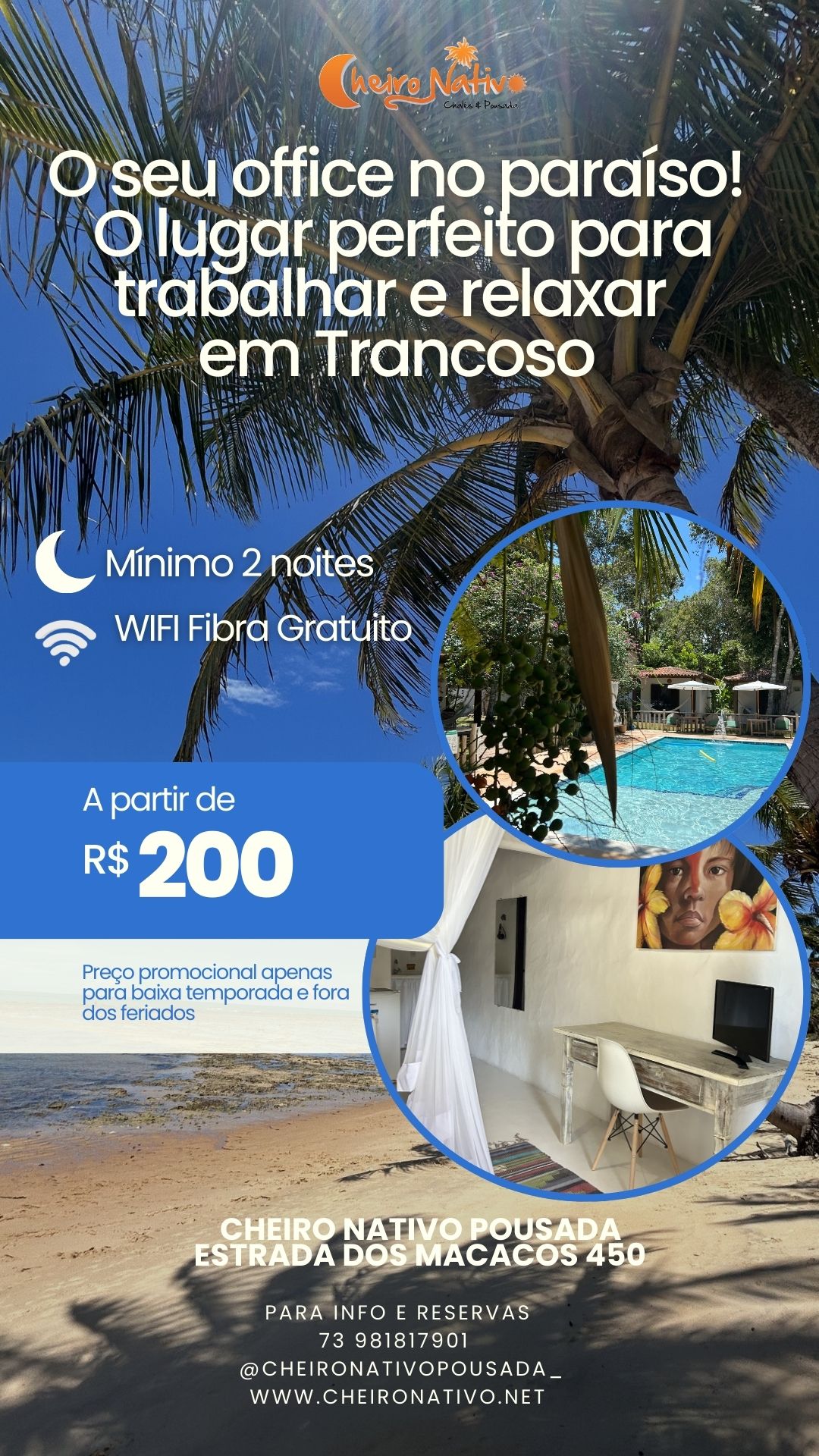 A Cheiro Nativo Pousada fica em Trancoso a cerca de 70km de Porto Seguro A Cheiro Nativo Pousada fica a 1,5km da 'Praça do Quadrado' e a 2km da praia mais próxima. Cada quarto é um chalé individual com rede e cadeira para relaxar na varanda externa. Cada quarto tem Mosquiteiro, Ar condicionado, Frigobar e TV Smart . Temos uma pequena academia para trabalho corporal e o uso é gratuito, estacionamento, piscina e um parquinho infantil O café da manhã não é incluído no valor da estadia