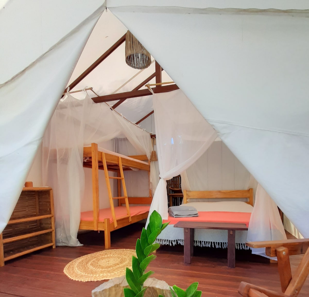 A 50 metros do mar, aproveite a experiência de uma hospedagem super autêntica e confortável - dormir numa tenda linda, ouvindo o barulhinho do mar e dos pássaros, com todo conforto necessário para suas férias serem diferentes e inesquecíveis. Suíte com ar condicionado, frigobar, mosquiteiro, roupas de cama e banho, varanda com espreguiçadeira e mesinha, espaço privativo e muita autenticidade, em frente a um jardim super gostoso.