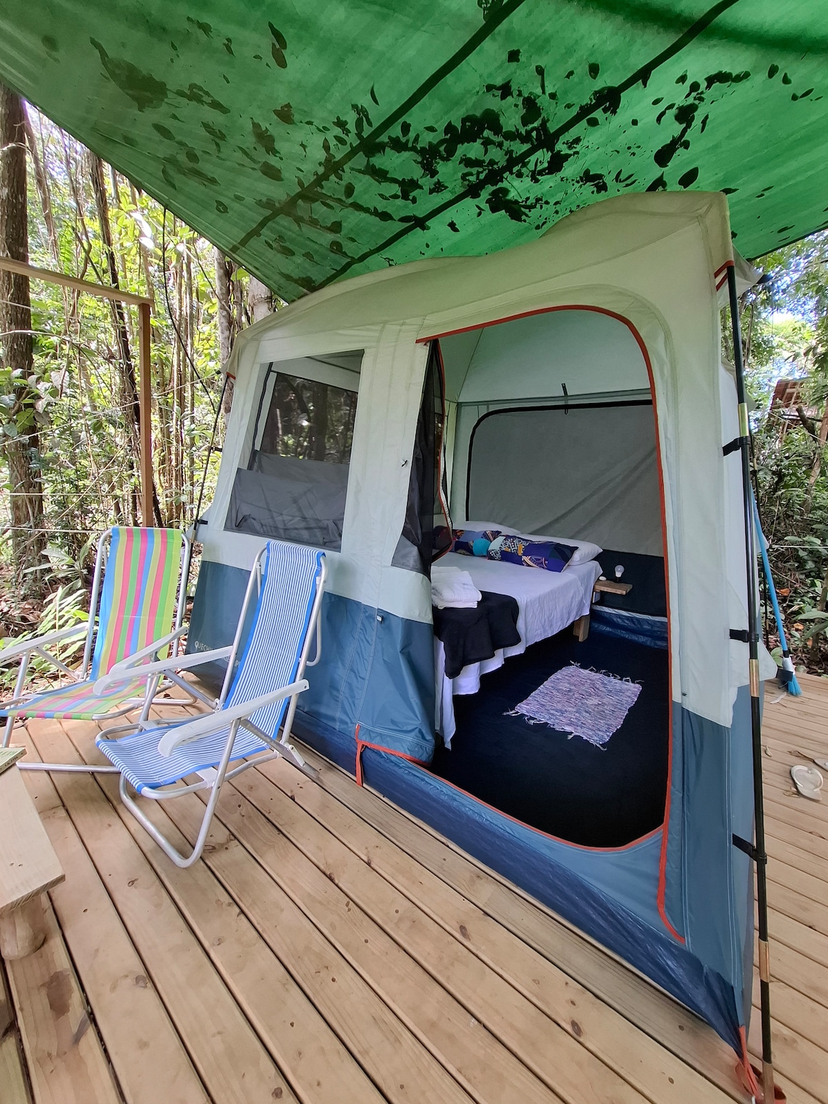 Barraca p/ 2 pessoas com colchão confortável. 🚿 Banheiro compartilhado 🍽️ Cozinha Afetiva e Coletiva 🔐 Chave exclusiva para entrada do Camping 📍 A 5 min do centro (de carro) 🌿 Estrutura completa: coworking, cine cult, redes, espaço kids, piscina, piscina terapêutica, sauna, palco, academia e armazém. Ideal para quem busca natureza, conforto e convivência!
