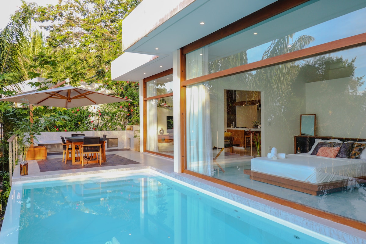 É um espaço calmo e cheio de estilo à 200 metros da praia, em meio a vegetação nativa! Somos LGBTQIAP+ friendly e por estarmos afastados do núcleo da comunidade desfrutamos de silêncio, tranquilidade e privacidade mas a cinco minutos do agito! A suíte conta com rede para o seu descanso, cama queen, cozinha preparada com todo o necessário para o preparo das suas refeições . A sala de banho conta com espaços reservados que garante a sua intimidade. Relaxe neste espaço!