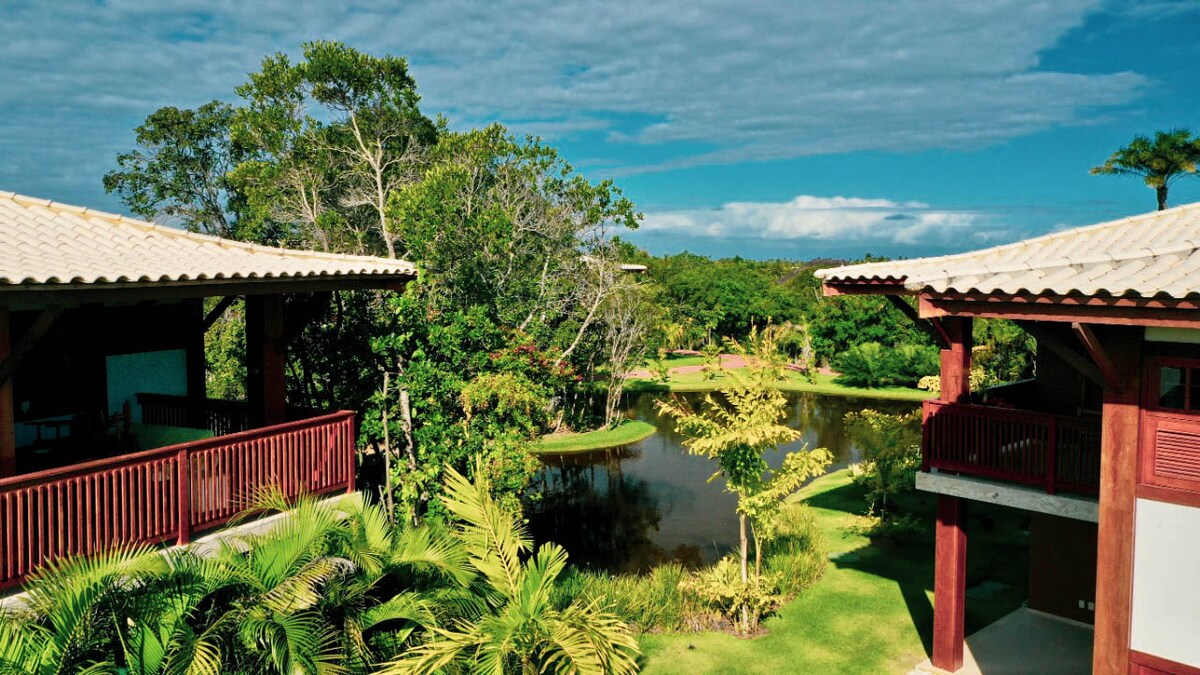 Divirta-se com toda a família neste lugar cheio de estilo. O Bungalow de Madeira está no Condomínio fechado Parque de Jacuipe com segurança 24hs á 700m da Praia e do Rio Jacuipe. Oferece tudo o que você busca para as suas férias! Excelente localização, entre Arembepe e Guarajuba no litoral Norte da Bahia. Conforto, bom gosto e simplicidade rustica em material de primeira qualidade são características desta residência que tem 3 banheiros, 3 quartos, sendo um deles suíte.