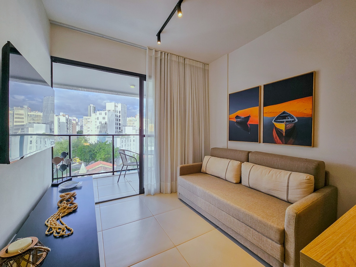 Lovely apartment with stunning ocean views, overlooking Salvador's main landmarks. From the balcony, besides the beautiful view of the All Saints Bay, you can admire the Bahia Marina, the Lacerda Elevator, the Solar do Unhão, and the São Marcelo Fort. The space is elegantly decorated, with environments equipped with everything you need, including a balcony with magnificent views. The bedroom features a comfortable queen-size bed, while the living room has a double sofa bed.