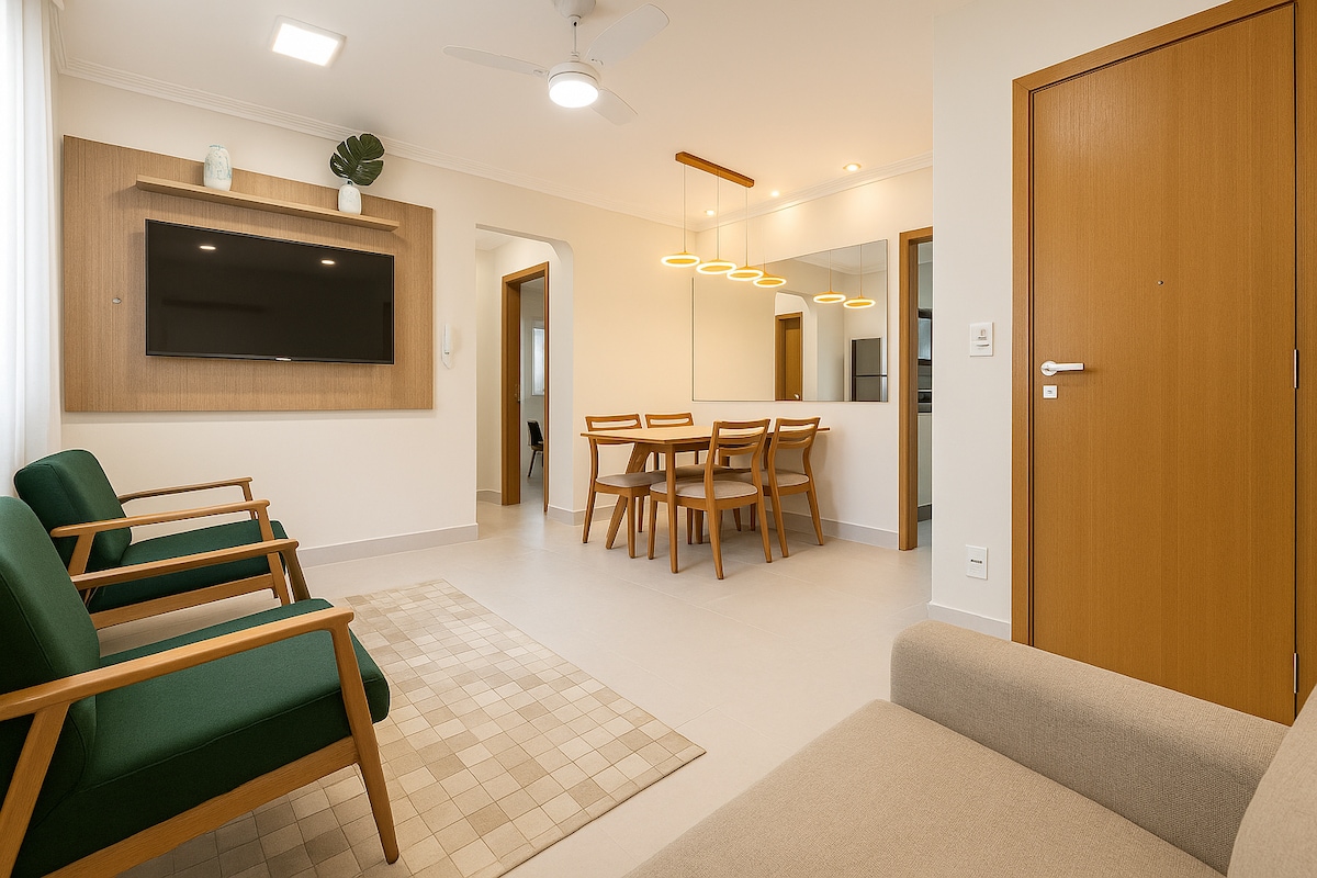 Apartamento à beira-mar com vista encantadora da praia, perfeito para dias de descanso e lazer. São 2 quartos aconchegantes, ambos com cama de casal e ar-condicionado, garantindo conforto em todas as noites. A sala, a cozinha e a sala de jantar são integradas, criando um ambiente acolhedor para compartilhar bons momentos. Um refúgio ideal para aproveitar a brisa do mar e viver momentos especiais em família ou entre amigos.
