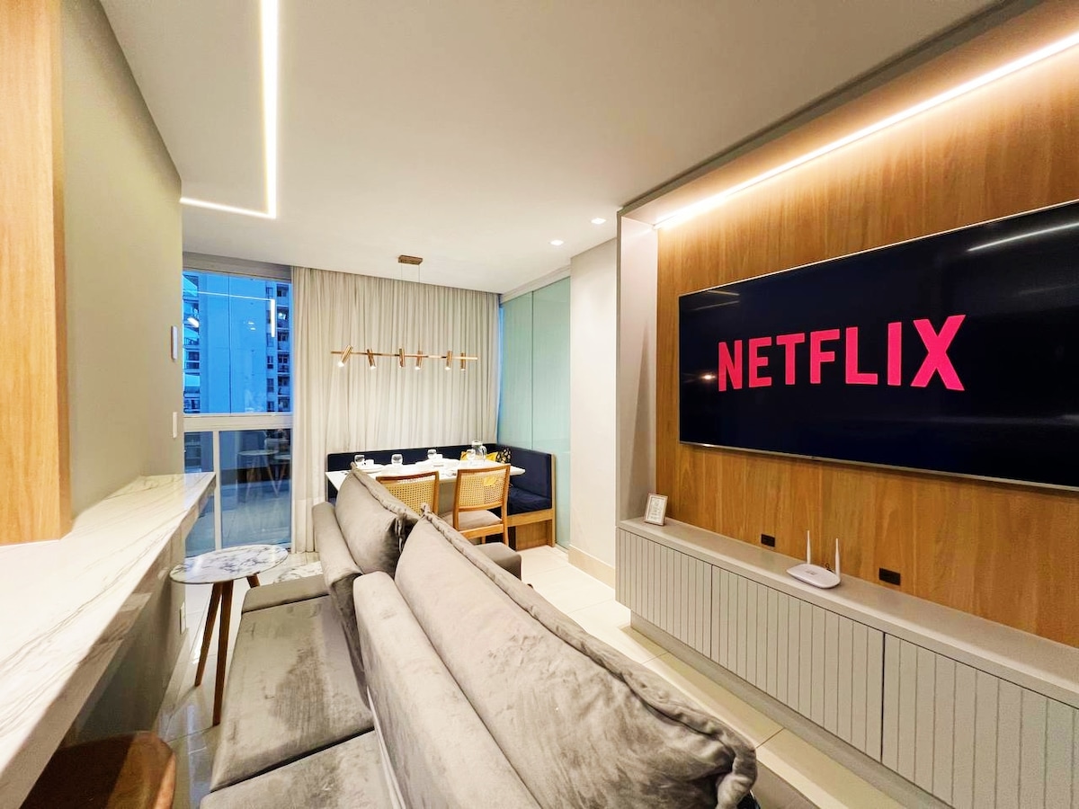 Nosso flat que foi decorado para você! Há 2 minutos a pé da areia, com vista mar no quarto. Aqui, temos a disposição um super quarto de casal com colchão Lush, o que há de melhor na hotelaria para o seu conforto. A cama é queen, com muito mais espaço! Além disto, uma TV de 55 polegadas deixam o ambiente muito mais acolhedor. Na sala temos um sofá cama casal, extremamente confortável, com sala ampla, e ventilador. CONFORTÁVEL MESMO! Fornecemos roupas de cama/banho!