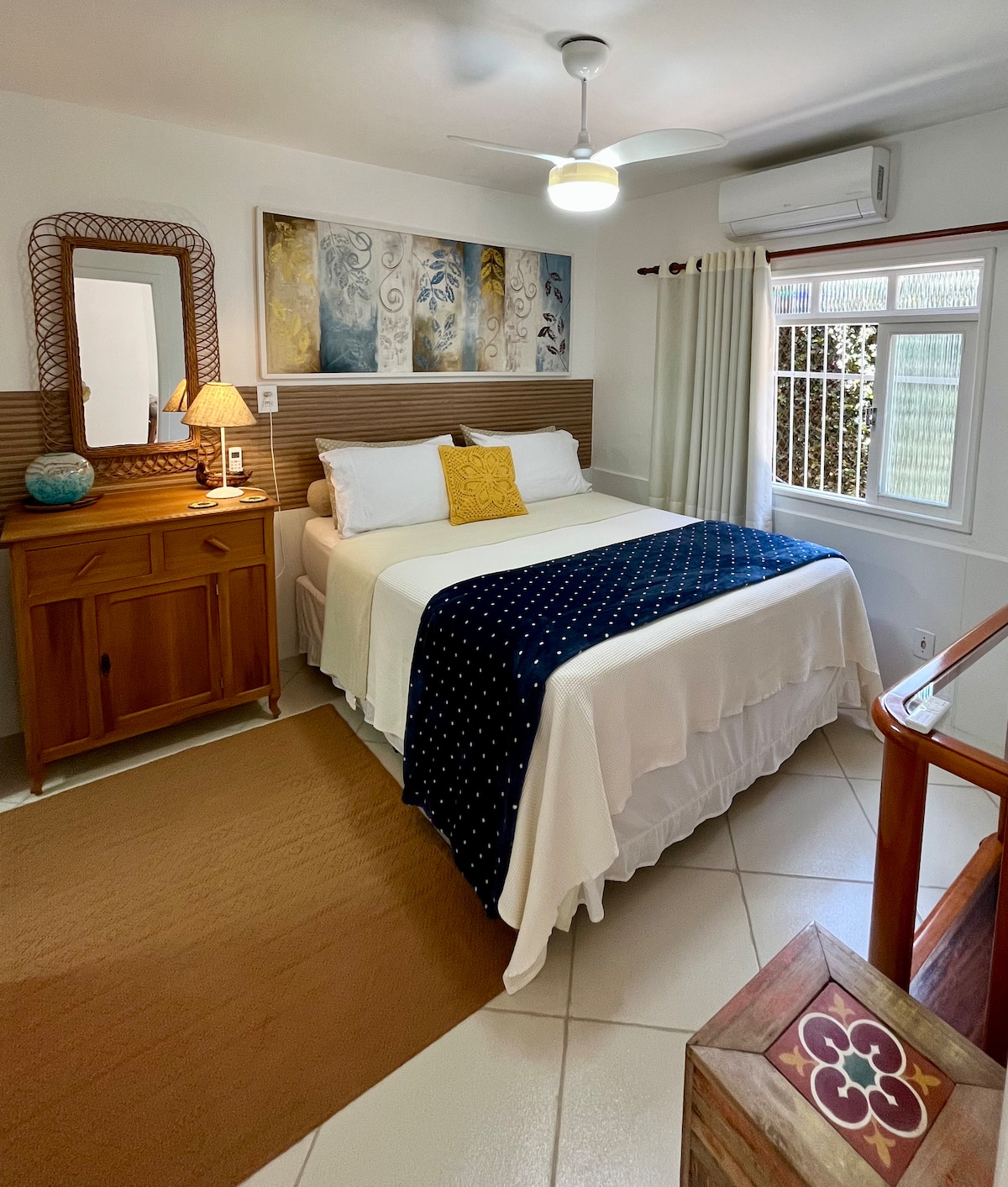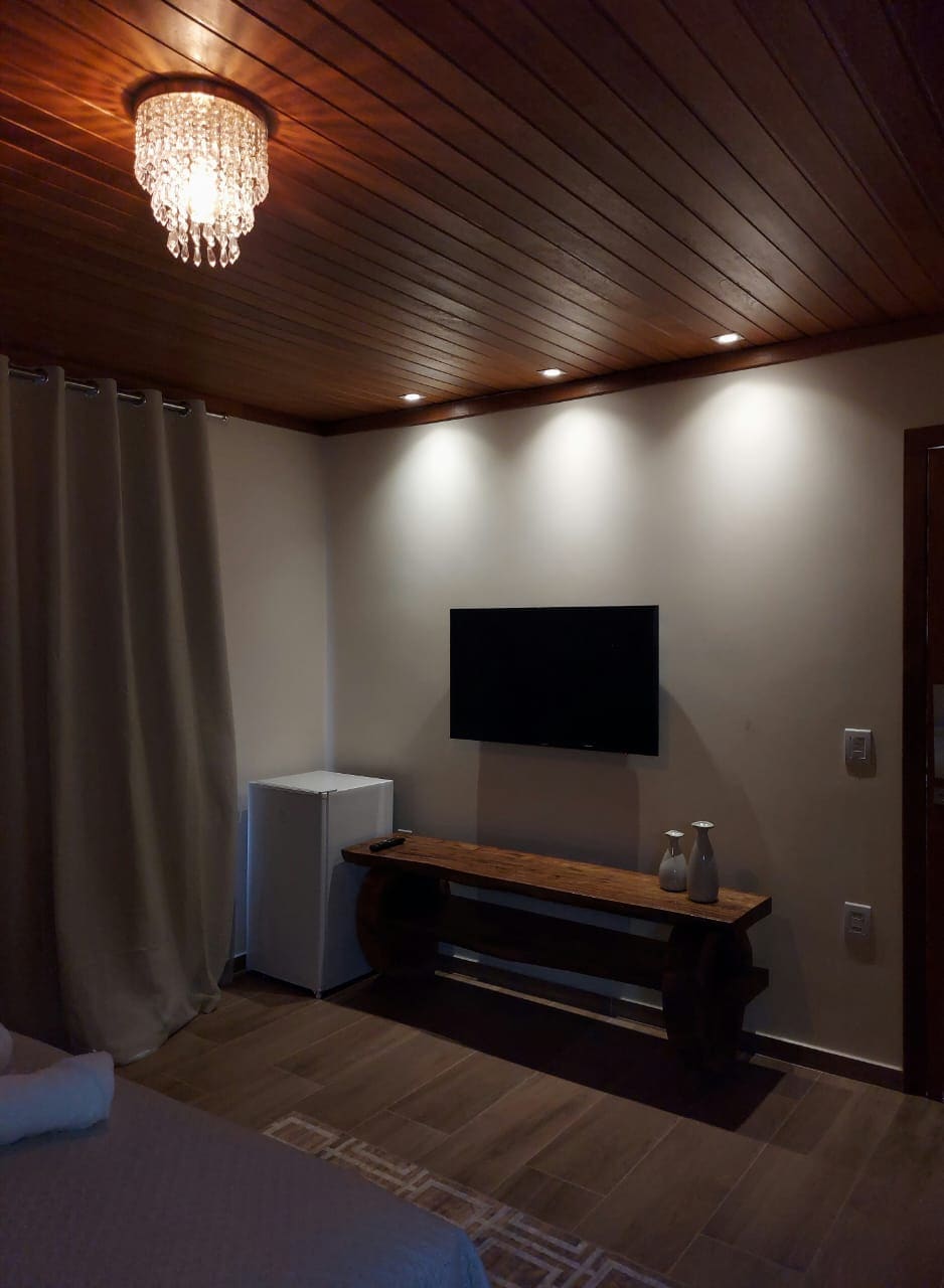 Curta uma Suíte com banheira de hidromassagem no piso superior, varanda para contemplação, ar quente e frio, frigobar, cama Queen, sofá cama, shampoo, condicionador, secador de cabelo. Mesa para refeição ou trabalho, wifi, estacionamento fechado, parquinho para as crianças, piscina, restaurante com chef.