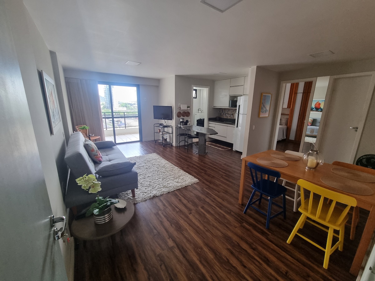 Apartamento aconchegante de 60 m² com 1 quarto, 1 banheiro, sala/cozinha e varanda com rede de proteção. Bem localizado próximo a um shopping center, ótimas praias, ciclovias na orla e área de negócios. O apartamento conta com roupas de cama e banho, secador de cabelo, utensílios de cozinha, talheres, fogão, geladeira, microondas, cafeteira, sanduicheira, liquidificador, material de limpeza e higienização...
