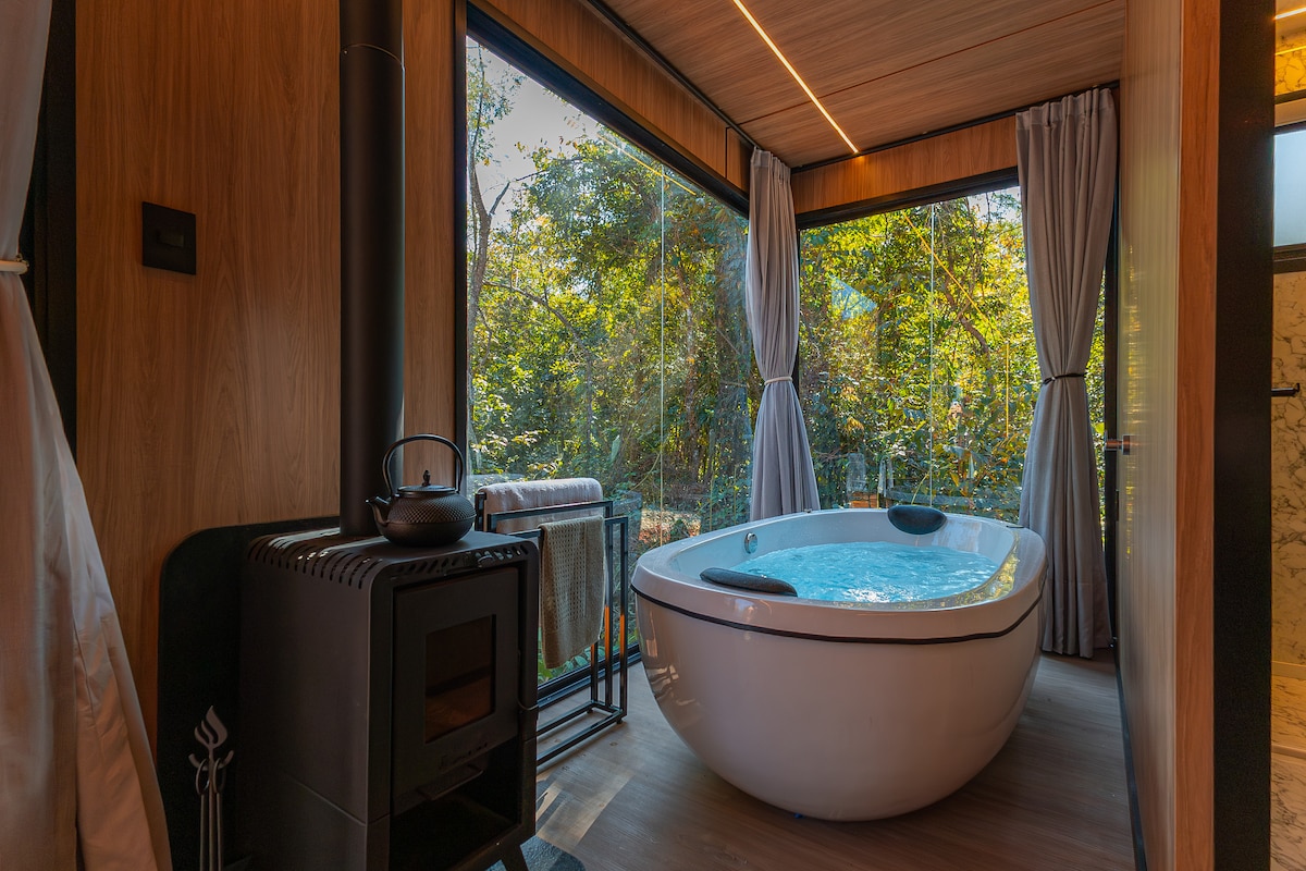 SIGA-NOS NO |NSTAGRAM @ENCANTOCERRADO Um refúgio moderno para casais no coração da natureza do cerrado. Com design contemporâneo e toques rústicos, a cabana oferece vistas panorâmicas, amanheceres e noites estreladas. Completa com uma cozinha totalmente equipada e sala de estar com hidromassagem. A varanda privativa inclui fogueira e piscina aquecida para momentos românticos. Uma oportunidade única de fugir da rotina, criar memórias e celebrar o amor em meio à natureza exuberante do cerrado.
