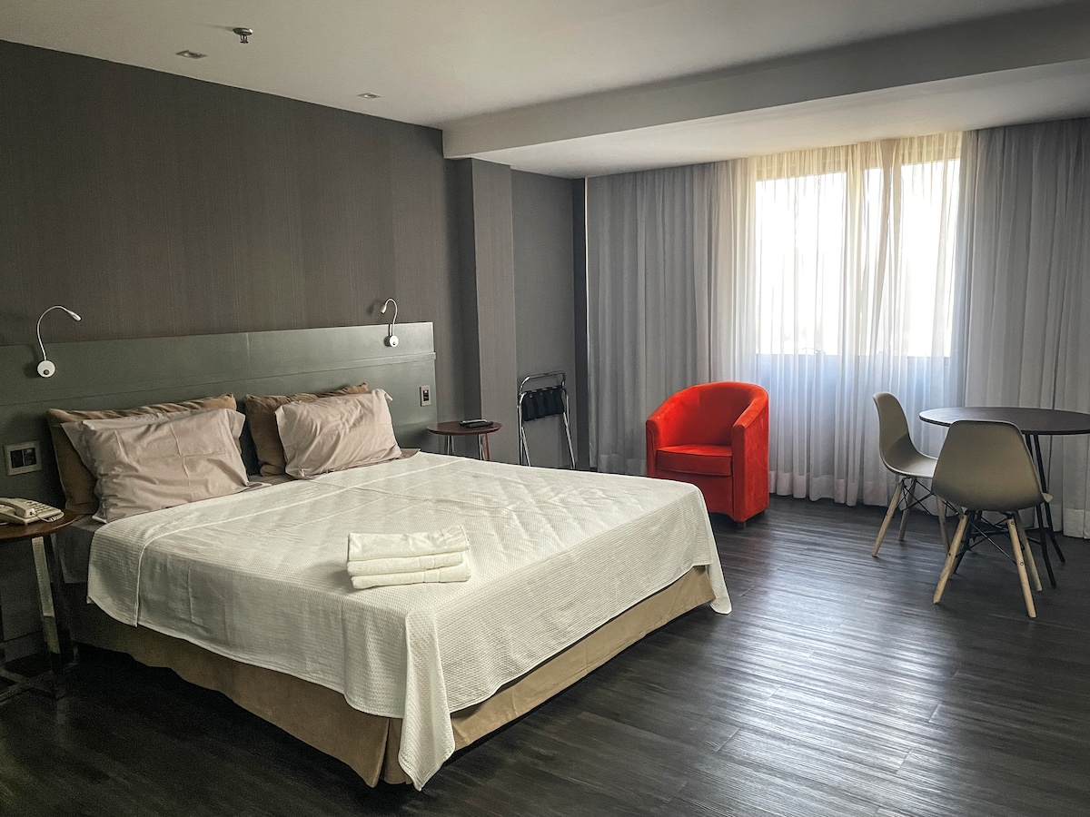 Aparthotel super confortável bem no centro de Brasília. Hotel com serviço de quarto diariamente, restaurante, piscina, academia, sauna, centro de convenções, shopping Brasília so atravessar a rua. A menos de 3 km. da esplanada dos ministérios, próximo aos principais pontos turísticos da cidade para trabalhar, descansar ou fazer turismo. Venha desfrutar da Capital Federal.