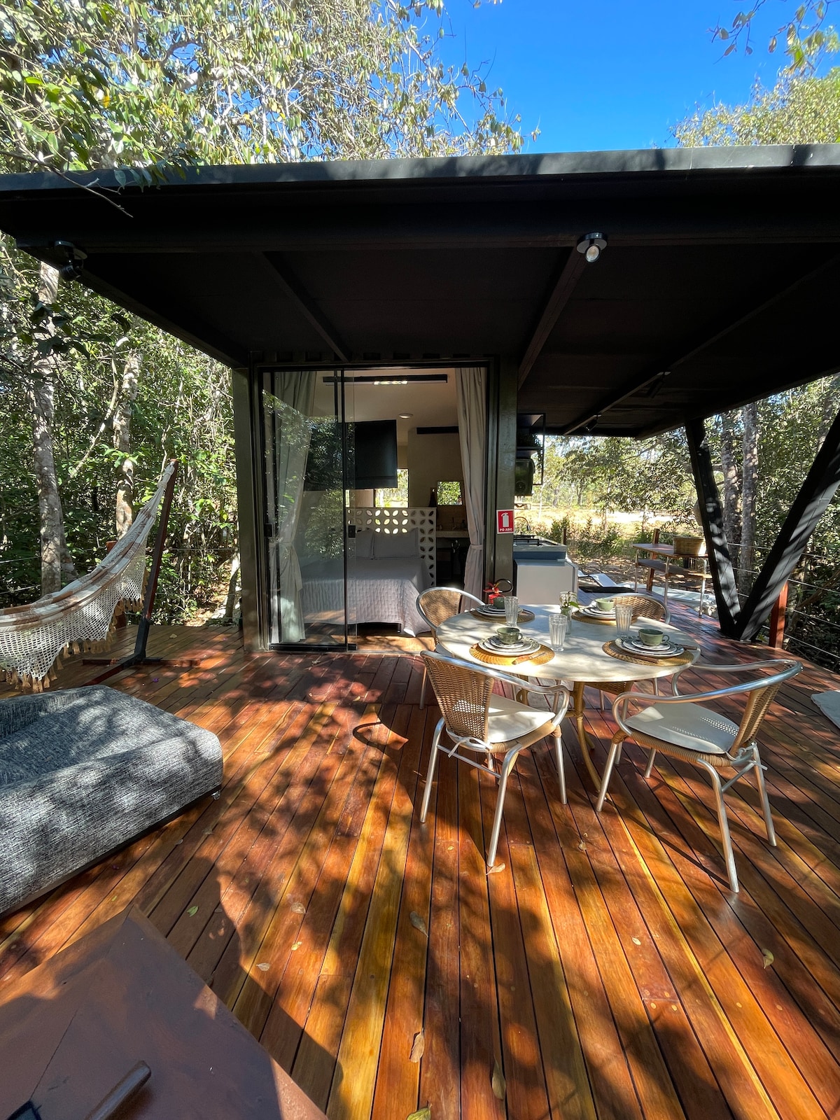 Uma tiny house feita com container, que possui um telhado verde, um deck móvel com mesa e camas retráteis e um cinema a céu aberto. Conceito sustentável e minimalista. Explore esse modo simplificado de viver em meio a natureza exuberante do cerrado goiano. Com uma vista linda da montanha e a poucos minutos do centro histórico.