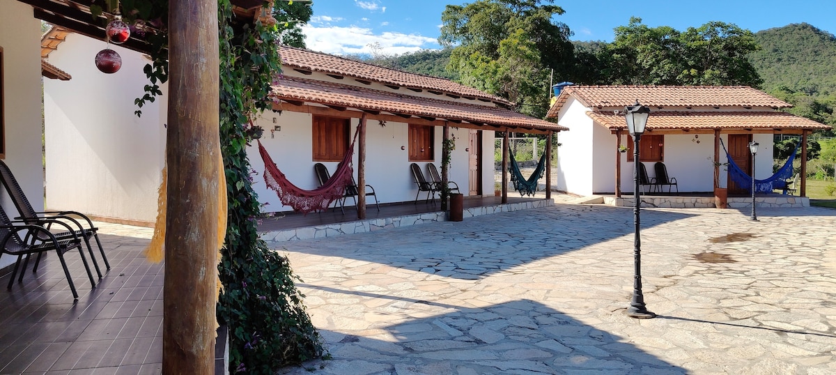 4 chalés espaçosos com varanda e cozinha externa bem equipada, em uma propriedade rural a 18 km de Pirenópolis. O local oferece o sossego da vida no campo aliado ao lazer completo: piscina, mesa de bilhar, churrasqueira, roda de fogueira e trilha na mata. Ideal para grupos