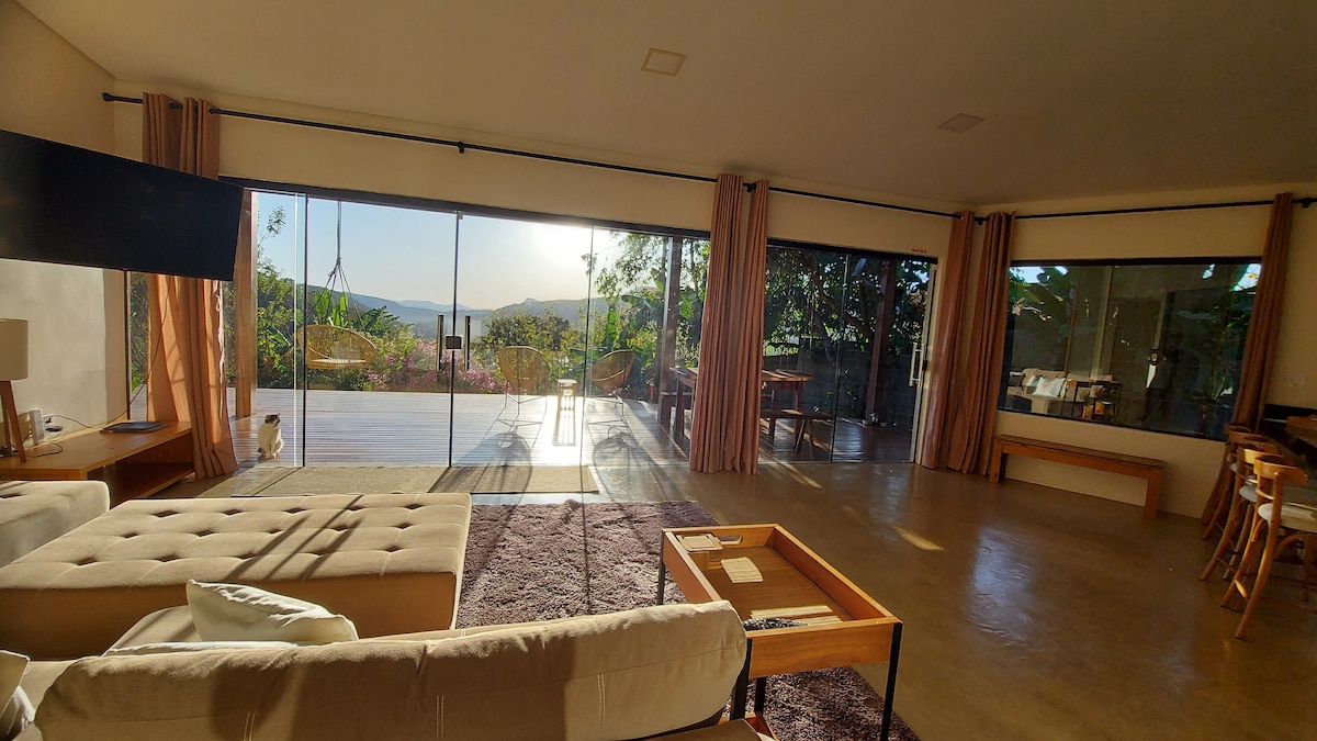 Bem vindos a nossa casa nas montanhas junto ao luxo da natureza, a magia da paisagem, o ar aconchegante a mata nativa tornam este local perfeito para descansar, contemplar a natureza e os pássaros que nos visitam. Bem iluminada e arejada, a casa tem um jardim de inverno que cria dois ambientes internos em conjunto com a natureza. Você vai chegar e sentir a paz e o silêncio que esse lugar proporciona. .600m da Avenida Principal de Alto Paraíso .Design diferenciado, planejada com Feng Shui