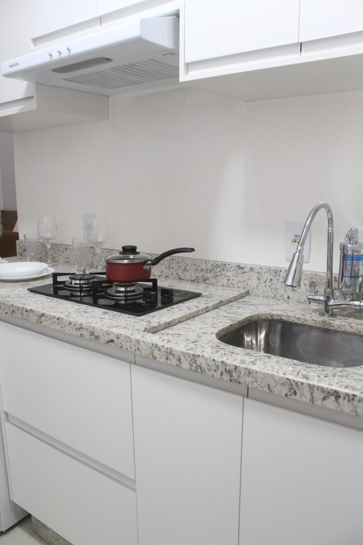 Apto 45 m2. Quarto:Cama Queen,armários,bancada escritório,TV 4K 50”,ar-cond.,roupa de cama/banho. Sala: sofá cama,TV 4K 50”,ar-cond.,mesa e 4 cadeiras design italiano. Cozinha:armários,bancada,cooktop 4 bocas,geladeira,forno elétrico,forno microonda,cafeteira elétrica,filtro água,sanduicheira, panelas,utensílios. Piscina borda infinita, hidro,sauna,academia,brinquedoteca,salão festa,espaços gourmet. 1 vaga garagem. Portaria 24 horas porteiro e segurança. Temos outro apto