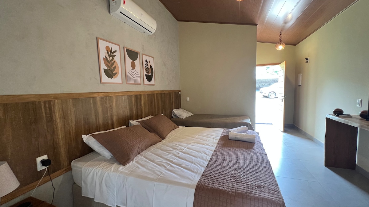 O quarto oferece a opção de uma cama de casal ou uma combinação de uma cama de casal e uma de solteiro. Inclui um banheiro privativo com chuveiro elétrico e toalhas de banho. Está equipado com ar-condicionado, TV e frigobar, proporcionando conforto para duas pessoas.