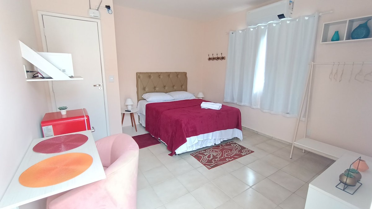 Suíte climatizada aconchegante, composta por uma mina cozinha para preparos rápidos com alguns itens básicos como panelas, pratos, talheres e xicaras , cafeteira, microondas, sanduicheira, cama de casal, roupas de cama e banho, mesa , bancadas, banheiro. Localização de fácil acesso, próxima de supermercado, farmácia, restaurante, lanchonete, bancos, lavanderia, ponto de táxi, parada de ônibus, tudo ao seu alcance. Há 4.8 km de carro do aeroporto internacional. 6.4 km do terminal rodoviário.