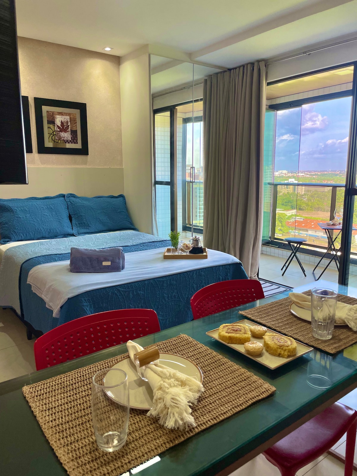 AP 1/4 moderno, aconchegante, em local seguro próximo de supermercado, shopping, bares/restaurantes, pontos turísticos andar alto, com vista, edifício com 2 piscinas, academia, hidro, sauna INCLUSO -Roupa de cama e toalhas - 1 vaga garagem - Cozinha completa - Lava louças - Maquina lava e seca roupas - Smart TV 65" c/ Netflix - Wifi - Alexa (Automação Residencial) - Cafeteiral Oster primalatte - Churrasqueira elétrica -Ar-cond no quarto e sala - Ferro de Passar - Secador