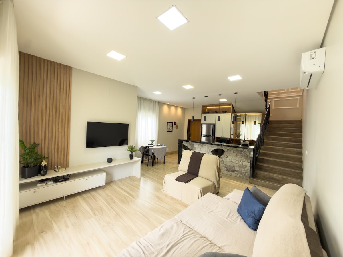 Hospede-se em uma casa com estética industrial autêntica, com bloco aparente, forro de madeira e piso de concreto polido. Um espaço confortável, aconchegante e cheio de personalidade. Localizada em bairro tranquilo e seguro, perto do centro. Destaque para a banheira estilo spa, perfeita para relaxar e viver momentos especiais. Ideal para casais e para quem ama arquitetura, design e boas experiências.