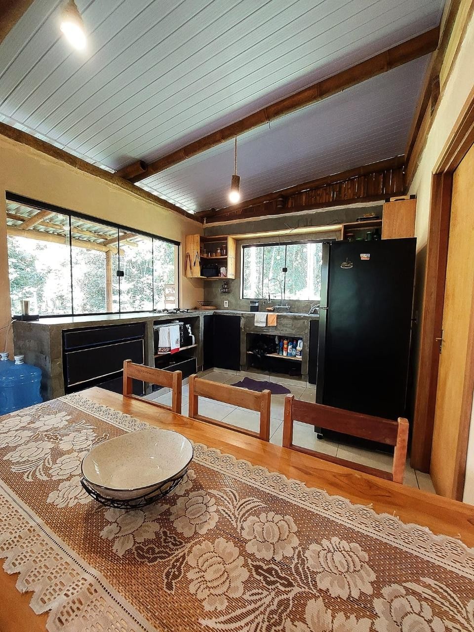 Casa no meio do mato com cozinha interna com fogão a gás e uma cozinha externa com fogão a lenha. Lareira na sala e banheiro . Devem trazer a própria roupa de cama e toalha de banho. Proibido ligar som de aparelhos sonoros. Não disponibilizamos de serviços de limpeza