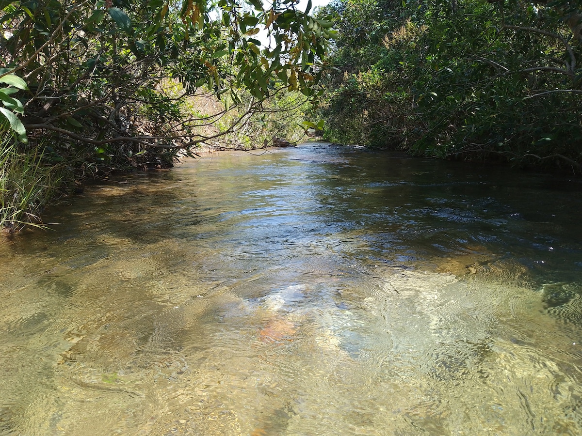 Situada numa reserva particular, cercada pelo Parque Nacional da Chapada, é um espaço para imersão consigo mesmo e a natureza. O chalé foi projetada para um casal ou 3 pessoas. O espaço é destinado a contemplação, meditação, reencontro com a natureza, trilhas ecológicas numa reserva de 4ha, observação de aves e fauna e férias românticas. Vale a pena ressaltar que os espaços comuns são partilhados com 3 outros chalés. Obs: FDS somente a partir 2 diárias. Crianças a partir 10 anos são bem vindos.