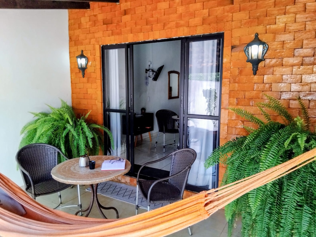 Situada numa reserva particular, cercada pelo Parque Nacional, é um espaço para imersão consigo mesmo e a natureza. O chalé foi projetada para um casal ou 3 pessoas. O espaço é destinado a contemplação, meditação,reencontro com a natureza, trilhas ecológicas numa reserva de 4ha, observação de aves e fauna e férias românticas. Vale a pena ressaltar que os espaços comuns são partilhados com 3 outros chalés.O chalé fica 5km do centro, sendo 1,5km de chão e 3,5km asfalto. Crianças apartir de 10anos.
