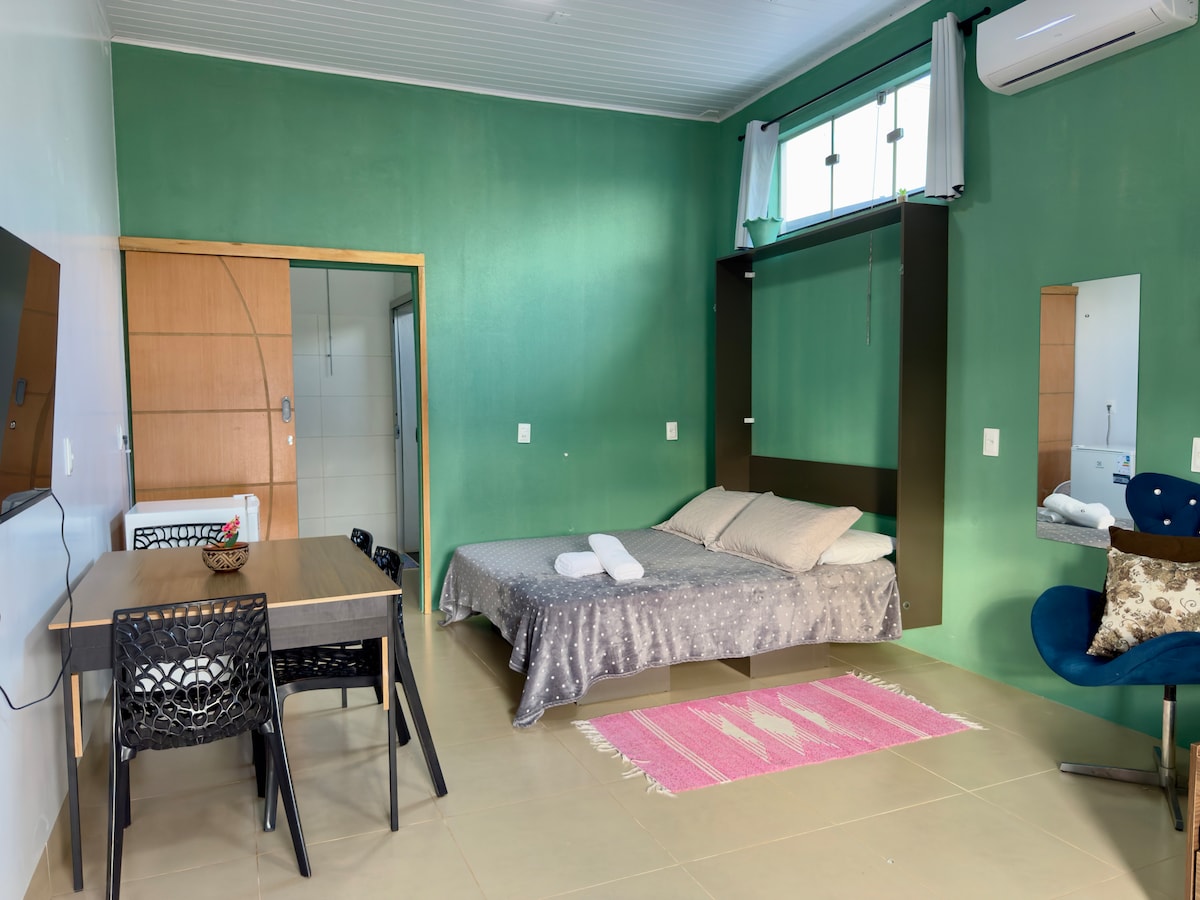 Descanse com conforto neste studio de 28m², equipado com cama de casal, sofá cama para 2 pessoas, ar-condicionado, TV, Wi-Fi e mesa de refeições, fogão, microondas . Ideal para casais, viajantes a trabalho ou quem busca praticidade com um toque de aconchego. Tudo foi pensado para que sua estadia seja tranquila, segura e agradável!