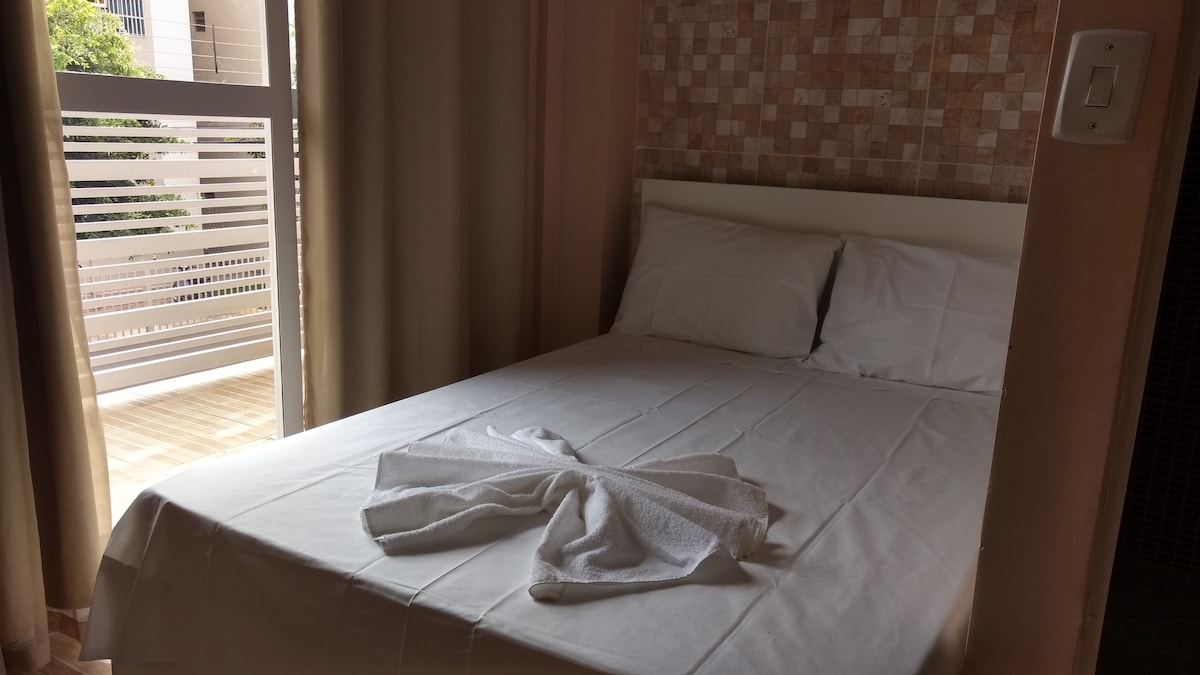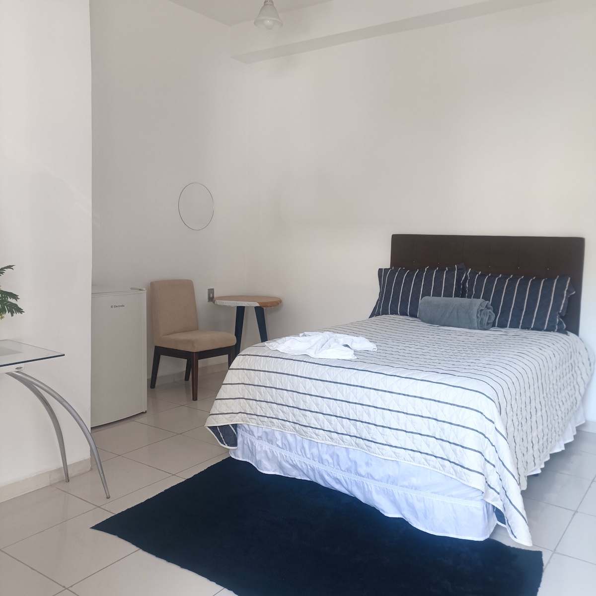 Acomodação aconchegante no centro de Cuiabá, a uma quadra do hospital Santa Casa e Igreja Bom Despacho. Mobiliada com uma cama de casal, armário, cômoda e escrivaninha. Banheiro privativo. Cozinha equipada com frigobar, micro-ondas, forno elétrico e armário de cozinha com todos os utensílios básicos. Wifi de 200mb contratados. *Não possui garagem/estacionamento na propriedade.