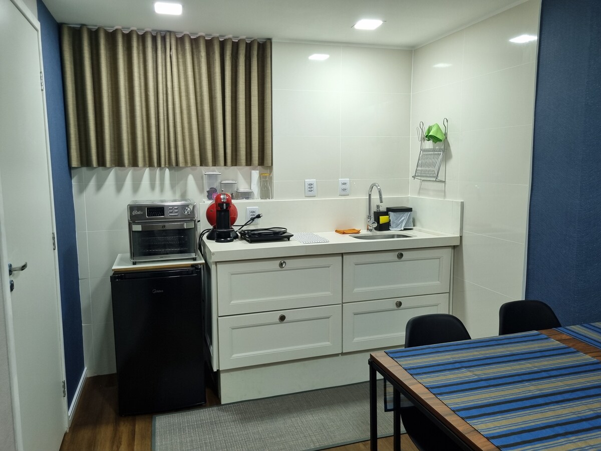Pequena cozinha equipada para fazer uma refeição rápida . Cafeteira Dolce Gusto, Air fry,panelavarroz, microondas, sanduicheira, frigobar e fogao induçaõ 1 boca. Quarto 3 x 4 com tv. Ar condicionado, 2 camas de solteiro, cabideiro, mesa . Banheiro 1.2 x 2.90 Box, chuveiro elétrico, vaso ducha higiênica, pia e espelho. Estamos entre as principais avenidas de acesso, centro, Universidades, aeroporto, saída para rodovia 364, shopping. Bairro tranquilo. Perto de tudo e longe do barulho.