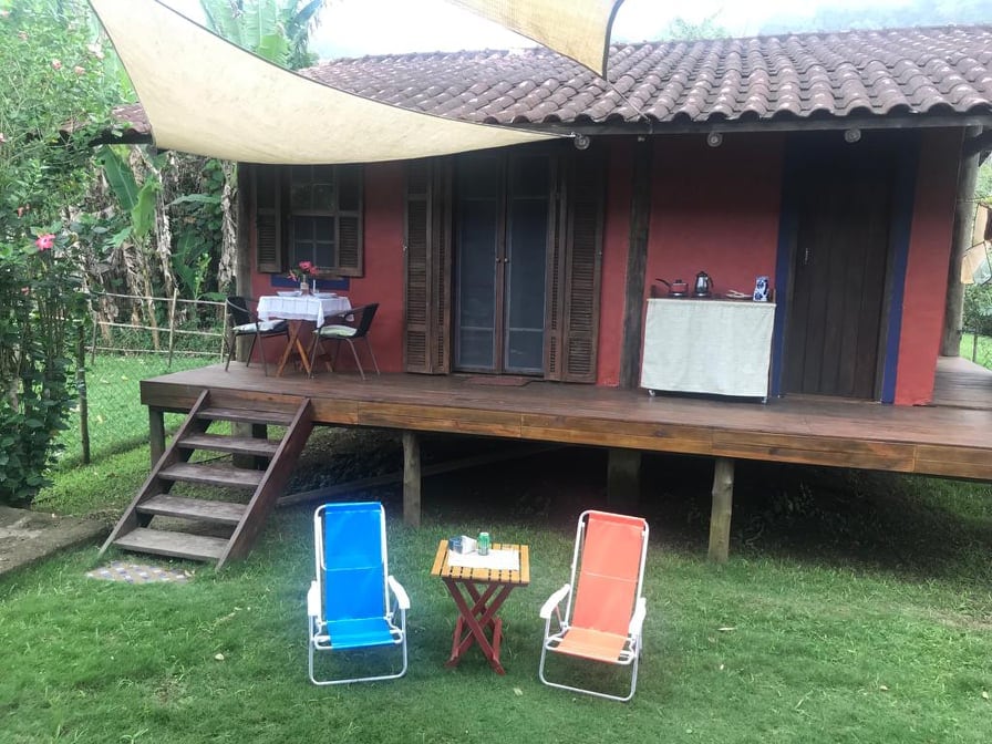 No chalé Vilarejo "areja um vento bom. / Na varanda, quem descansa vê o horizonte deitar no chão". É um pequeno chalé, charmoso e romântico para o casal; uma aventura na "casa da árvore" para família com crianças; o espaço ideal para o camping e churrasco com amigos - e chuveirão para refrescar. Cozinha simples, com o fundamental, como panelas e kit p/ café. Quarto com cama de casal e pufe/colchão de casal no chão. Para mais de 4 pessoas, é possível levar barraca (s) para até mais 4 pessoas.